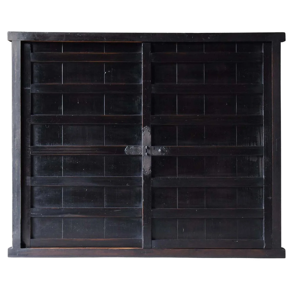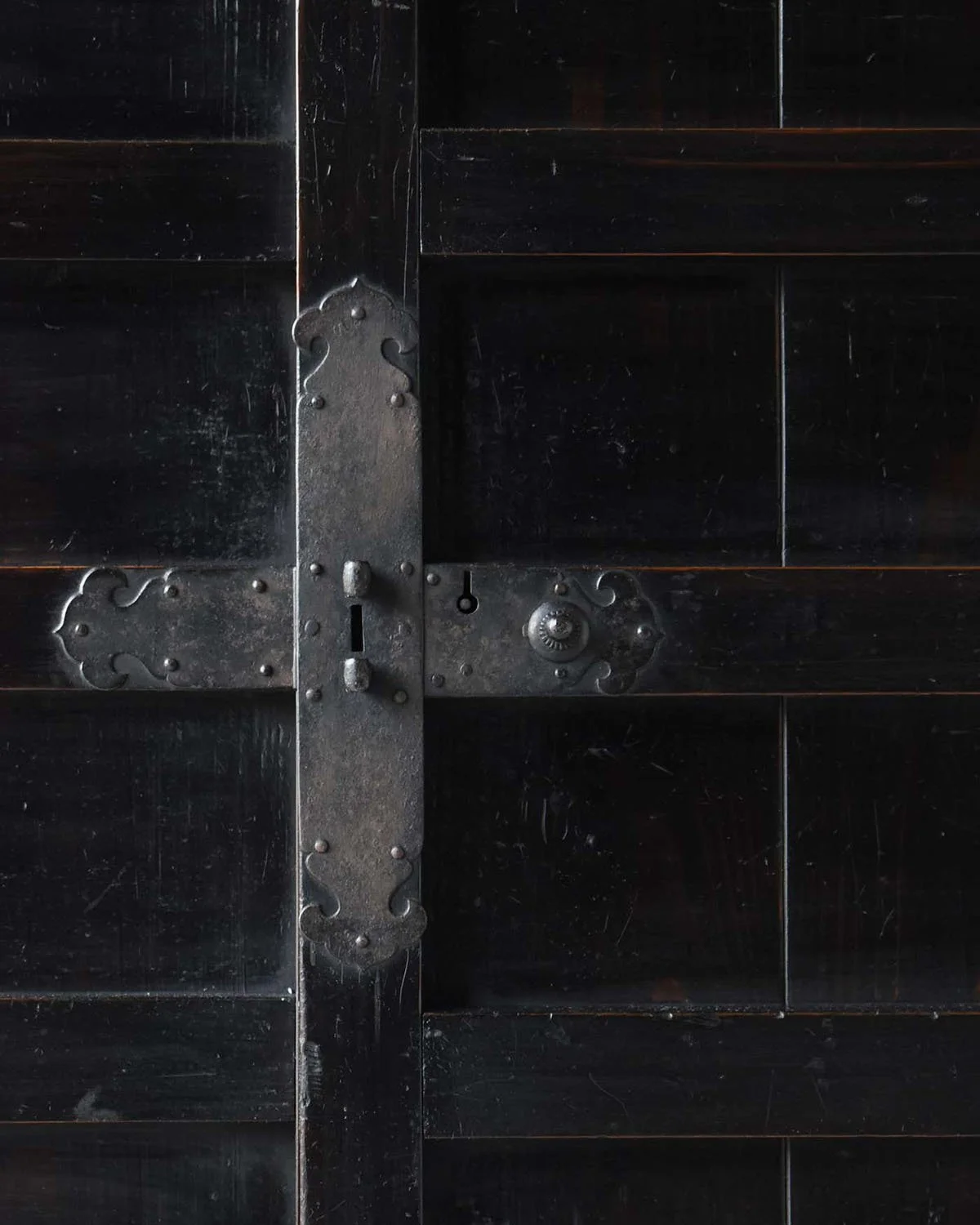 A wide cabinet constructed in thick cedar boards with a darkened surface developed through age and use. The façade is defined by horizontal rails and vertical planks, secured by a central iron latch plate. Interior fitted with removable shelving