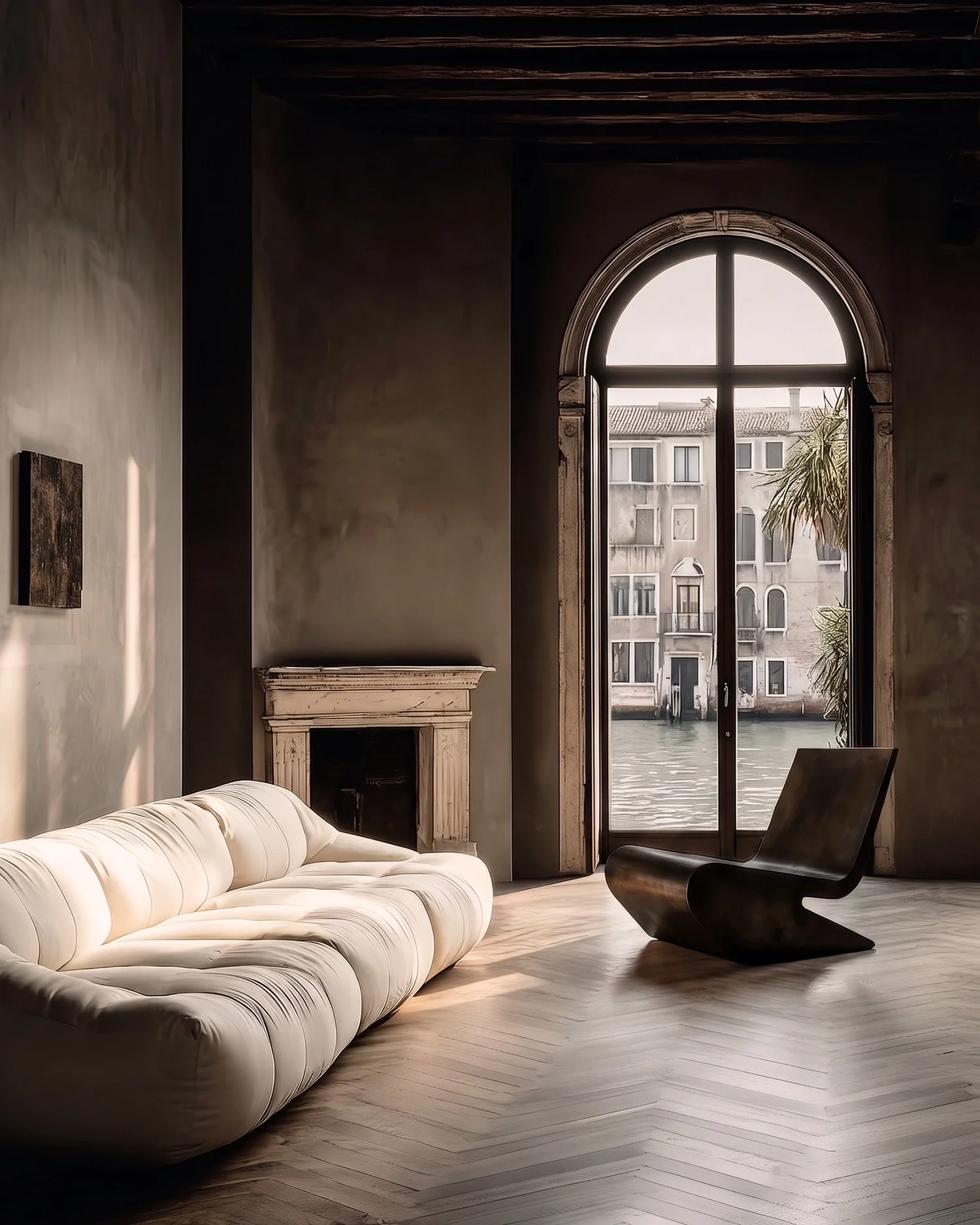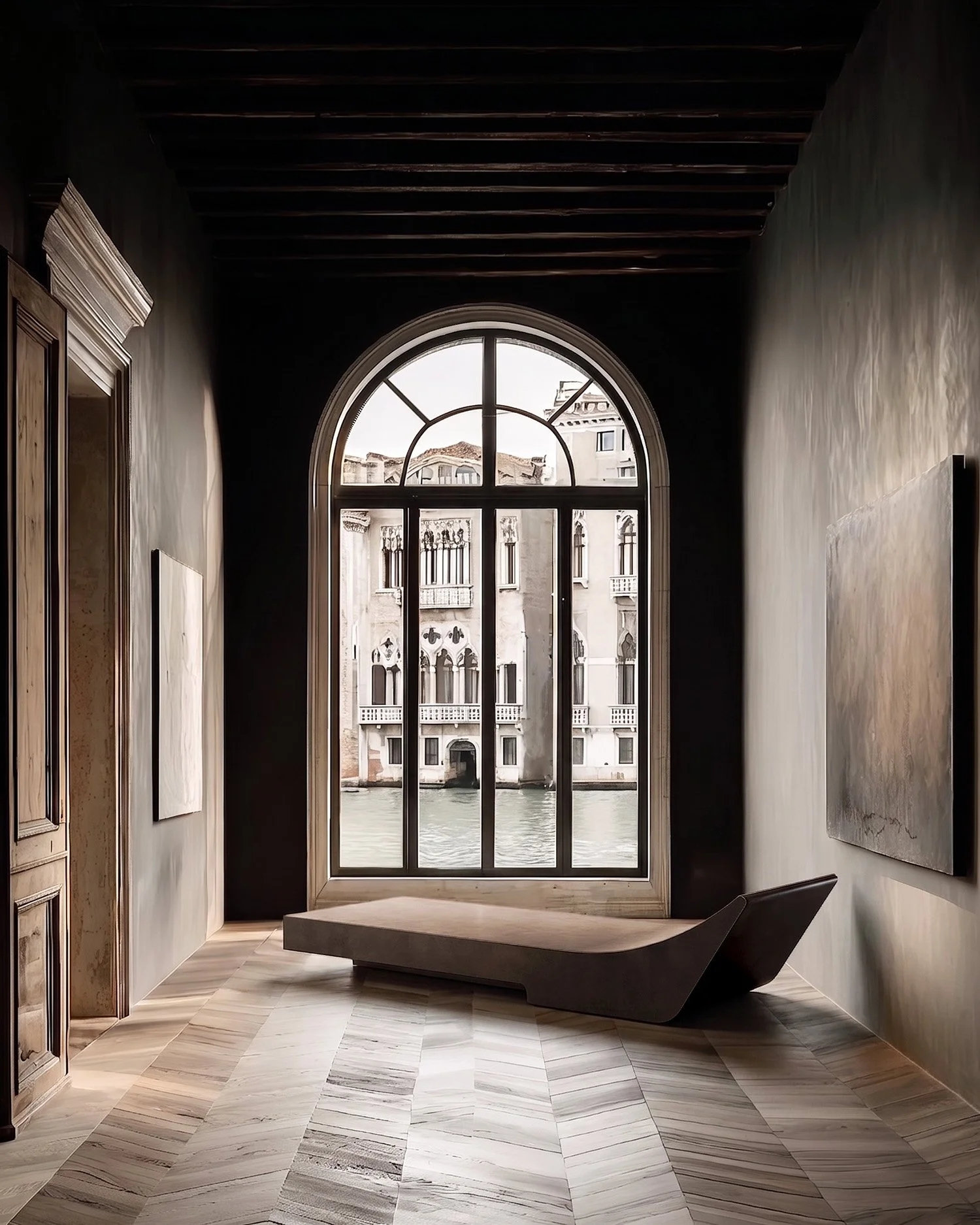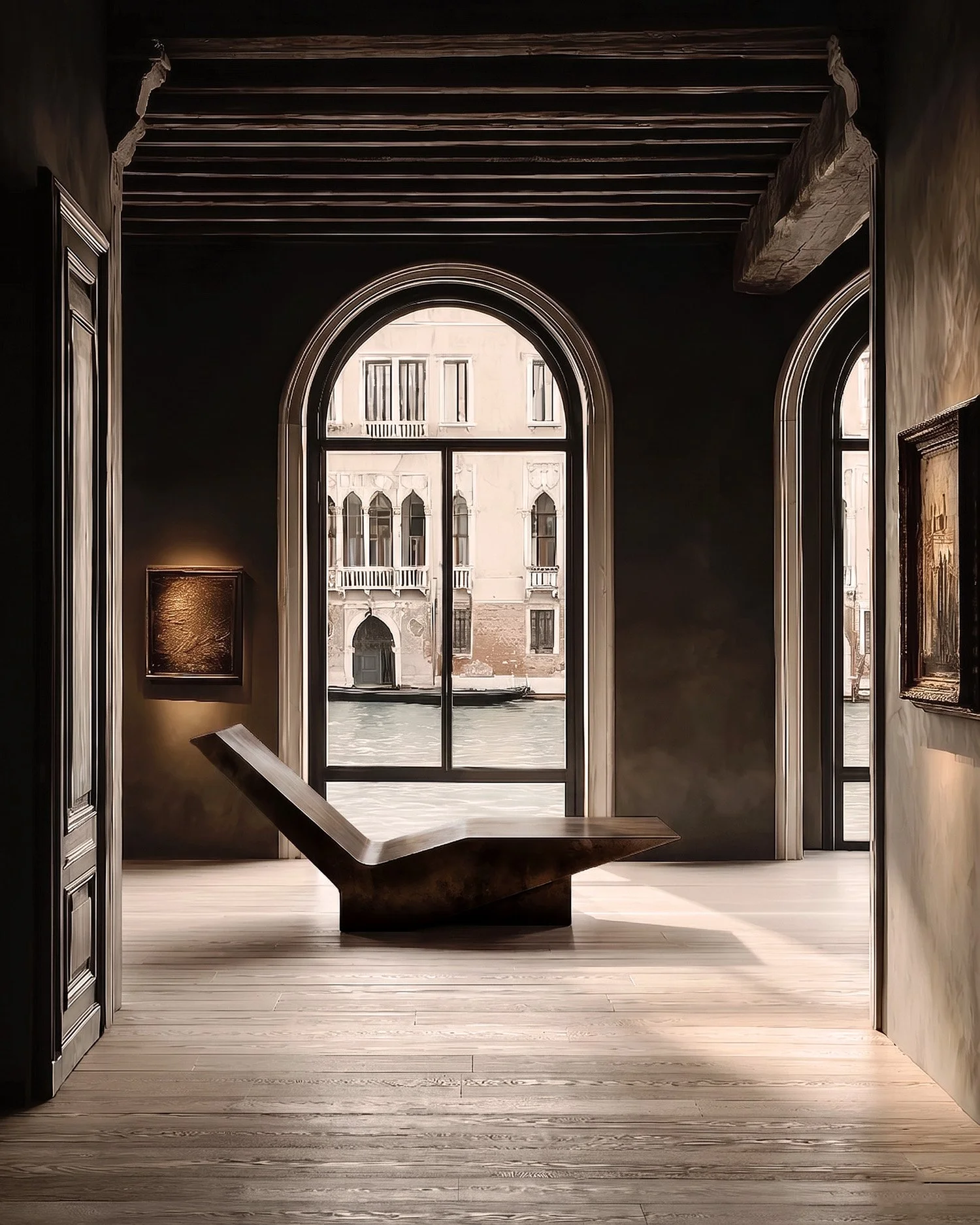 Just as important is the architecture itself. Exposed timber beams, arched canal windows, and fragments of classical stonework do more than frame the collection; they draw it into a longer visual history. Venetian light moves across metal, plaster, and upholstery in a constant state of adjustment, giving the room a shifting chiaroscuro throughout the day. The collection does not imitate the past, nor does it compete with it. It meets it with equal conviction