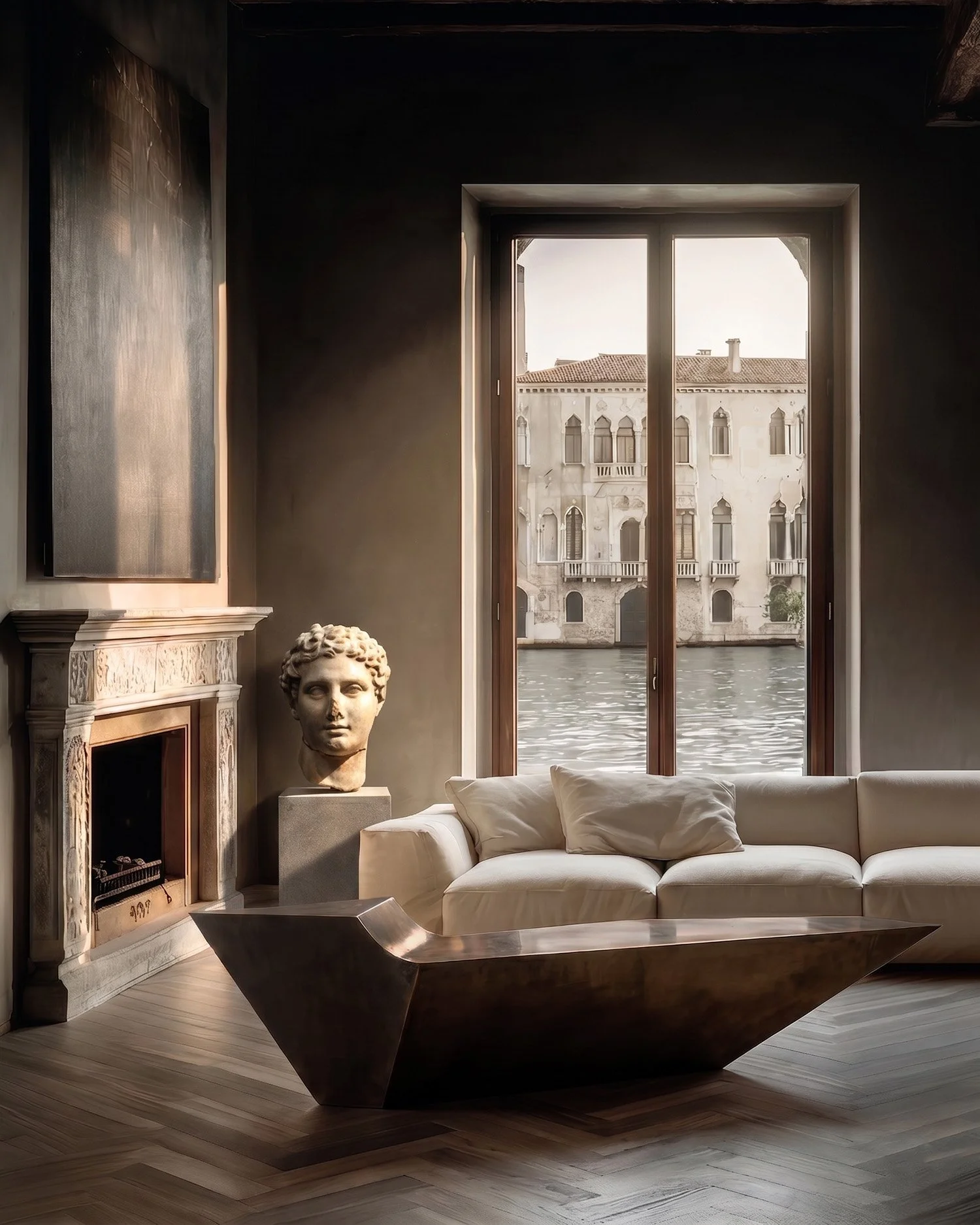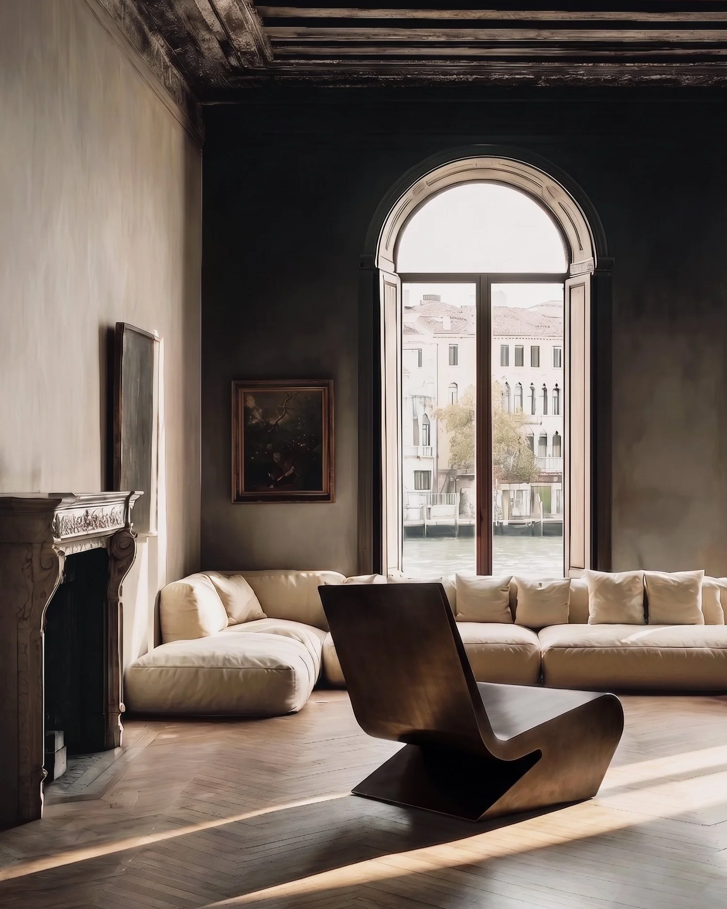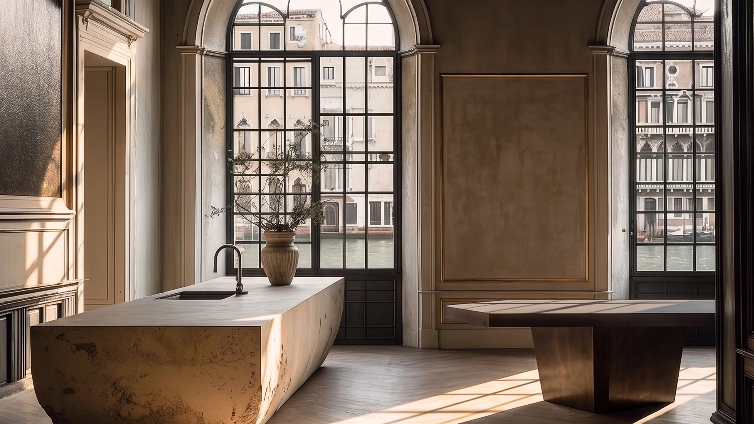 Just as important is the architecture itself. Exposed timber beams, arched canal windows, and fragments of classical stonework do more than frame the collection; they draw it into a longer visual history. Venetian light moves across metal, plaster, and upholstery in a constant state of adjustment, giving the room a shifting chiaroscuro throughout the day. The collection does not imitate the past, nor does it compete with it. It meets it with equal conviction