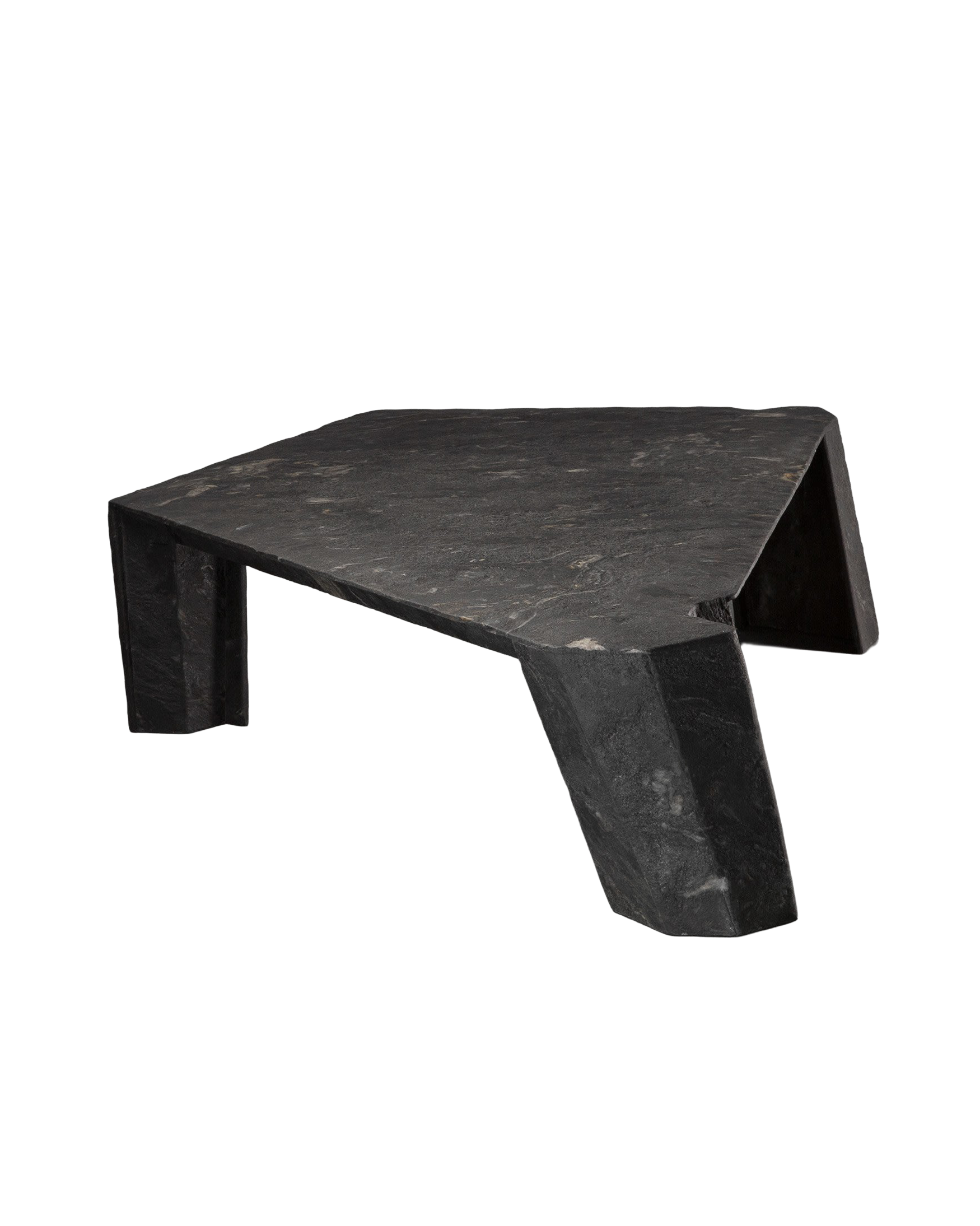 The monolithic DC2002 coffee table is made from black granite. Vincenzo De Cotiis chooses not to present the material highly-polished, as is traditional, but to use the natural texture of the stone to distort light refracting from its surface. The combination of colour and texture disrupts a viewer’s perspective, rendering the 3-dimensional object into an abstract silhouette, only broken up by the mineral variations of the stone