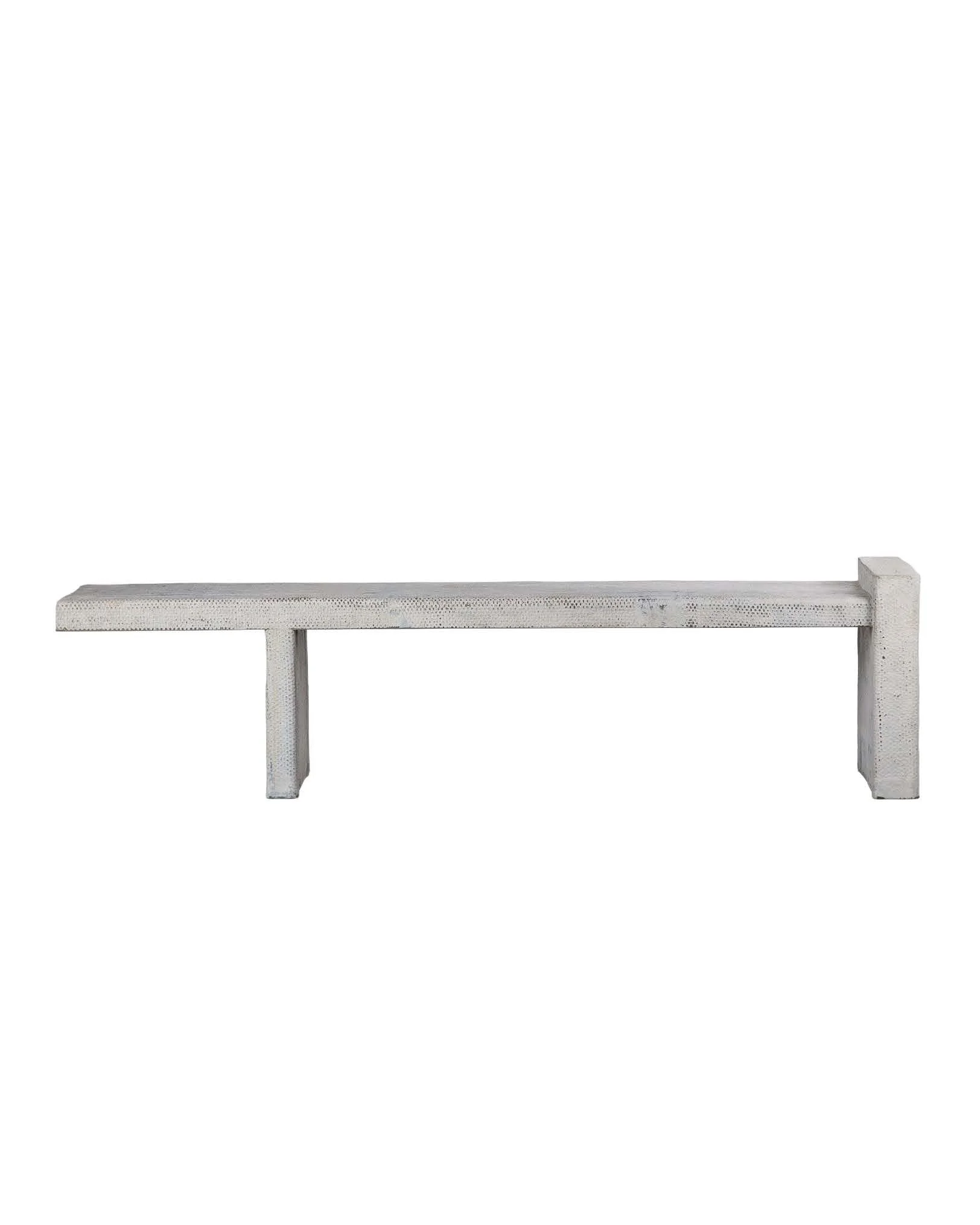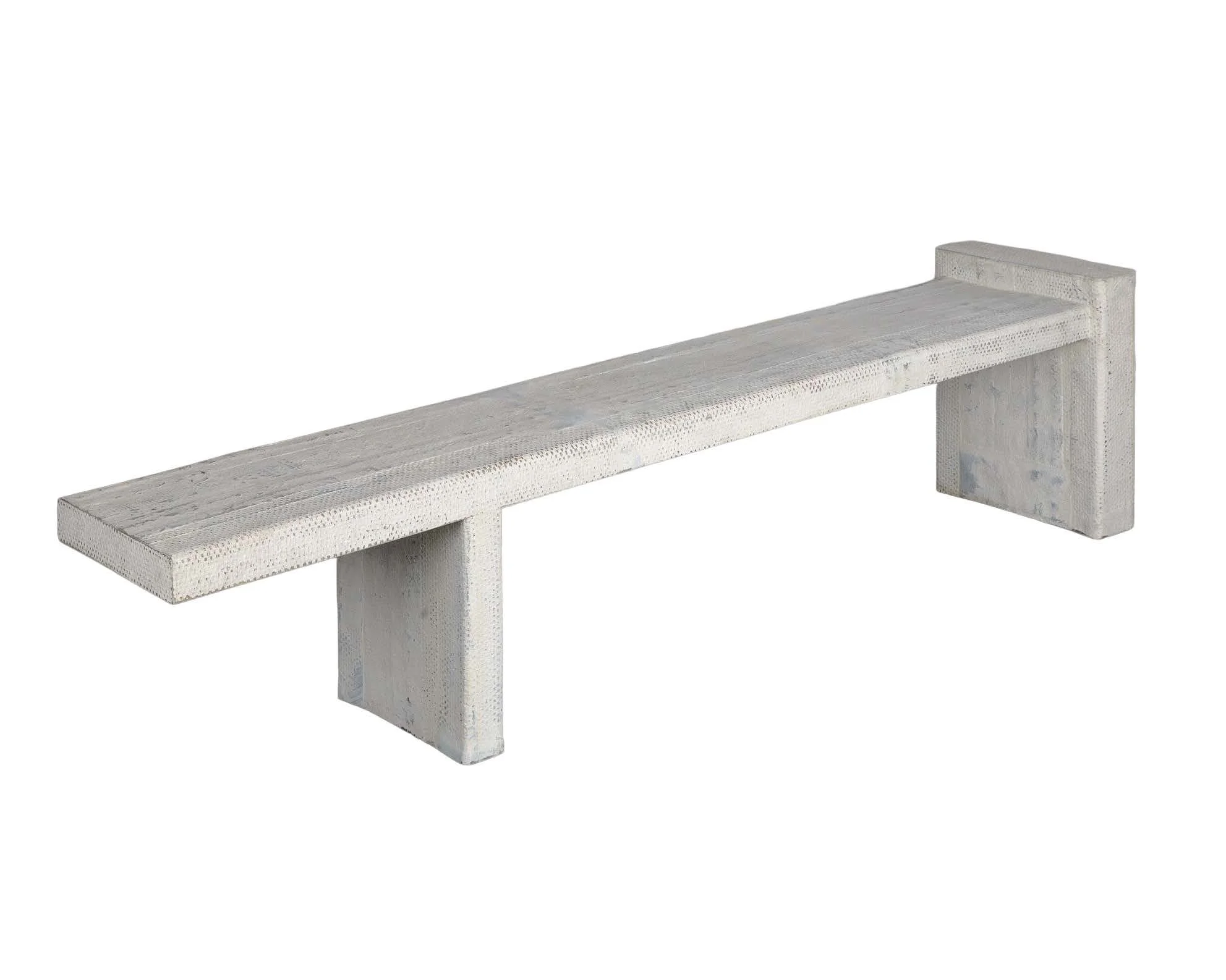 The DC2104 Bench combines architectural precision with functional grace. Sculpted with hand-painted recycled fiberglass, the bench bestows ambiguity through its materiality and craft; the viewer is invited to ponder its temporality, and to question the material’s time of creation. The white, textural surfaces and imprinted patterns nod to the imprints of mankind in the urban environment
