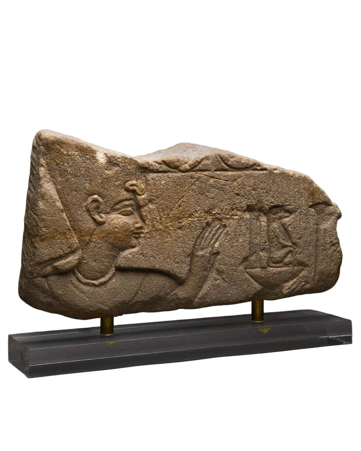 Sculpted in sunk relief, this sandstone fragment shows a pharaoh facing right, wearing a broad collar and either the Red Crown or Double Crown fronted by a uraeus. He presents a Sbt (clepsydra or water clock) to a goddess, of which only the lily-topped scepter remains preserved to the right