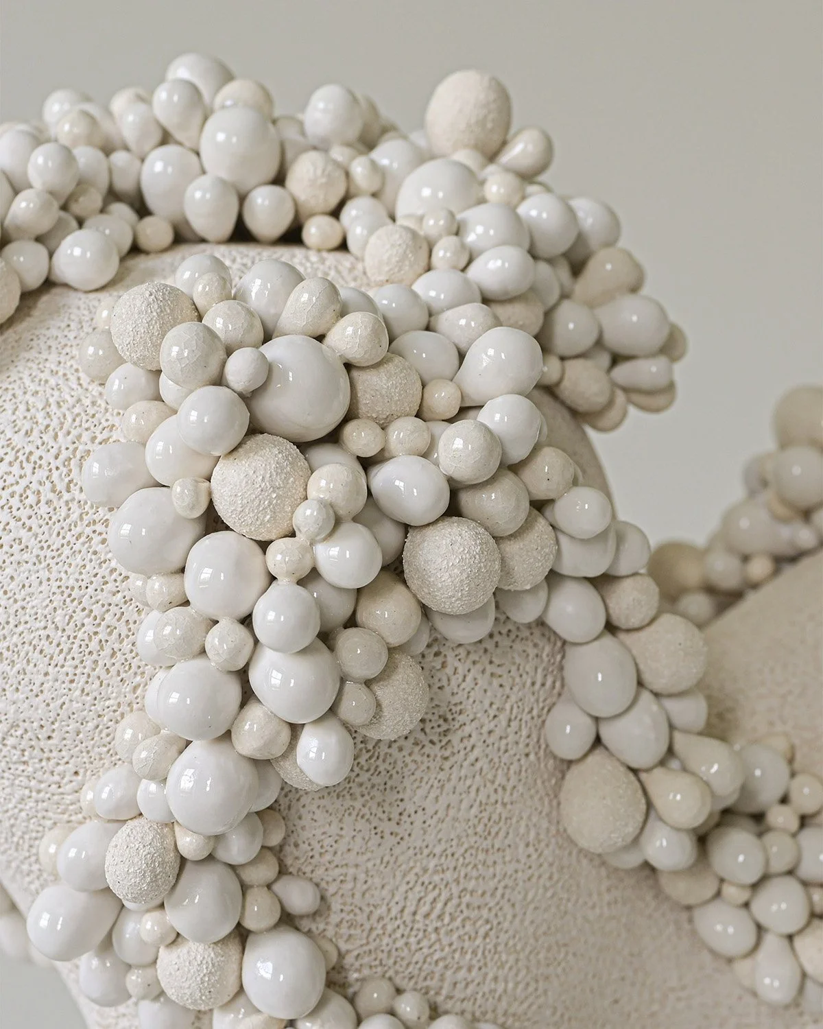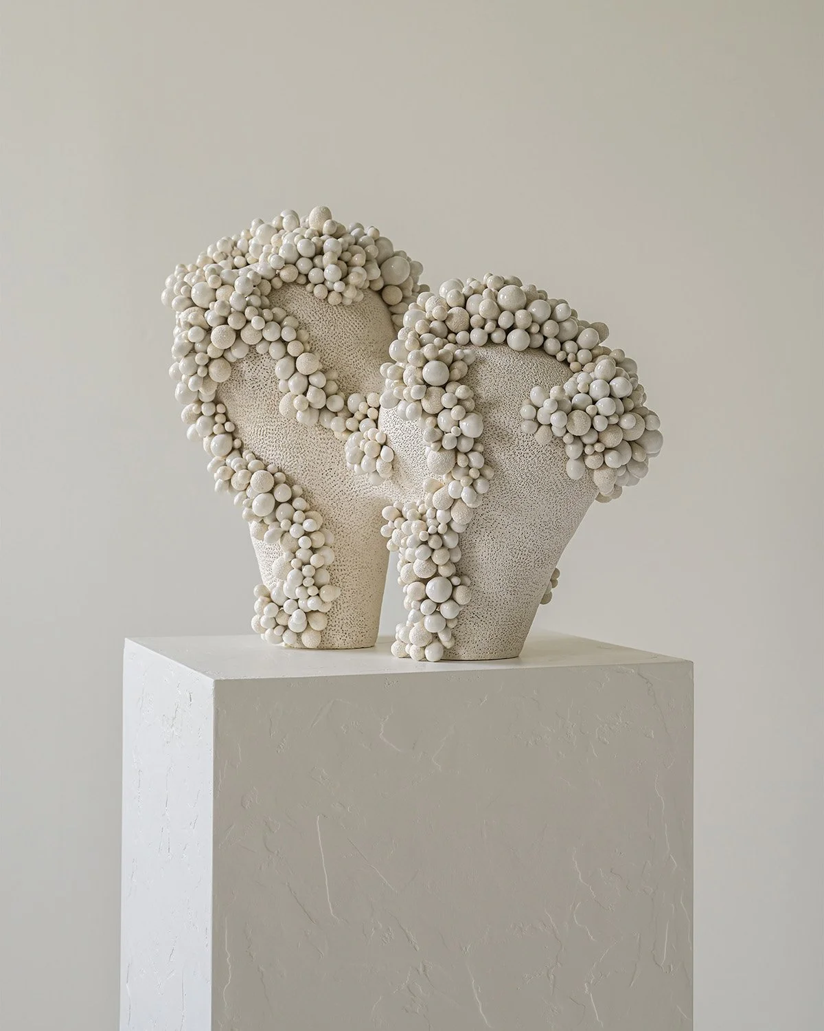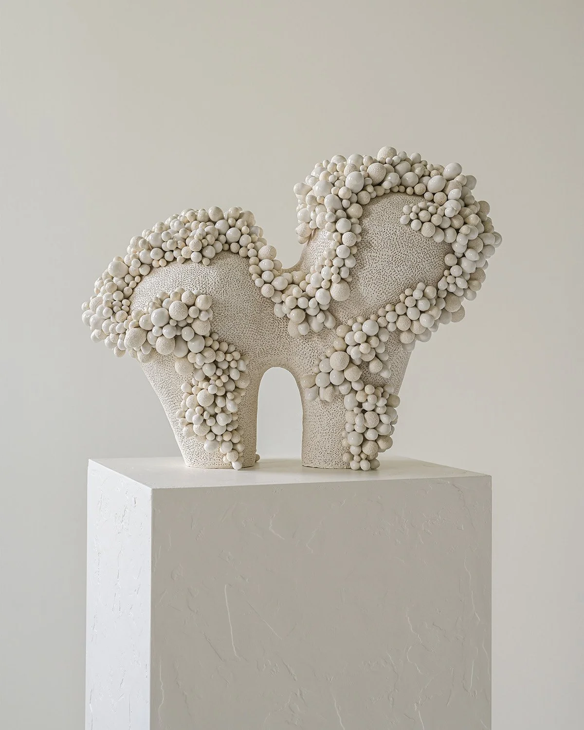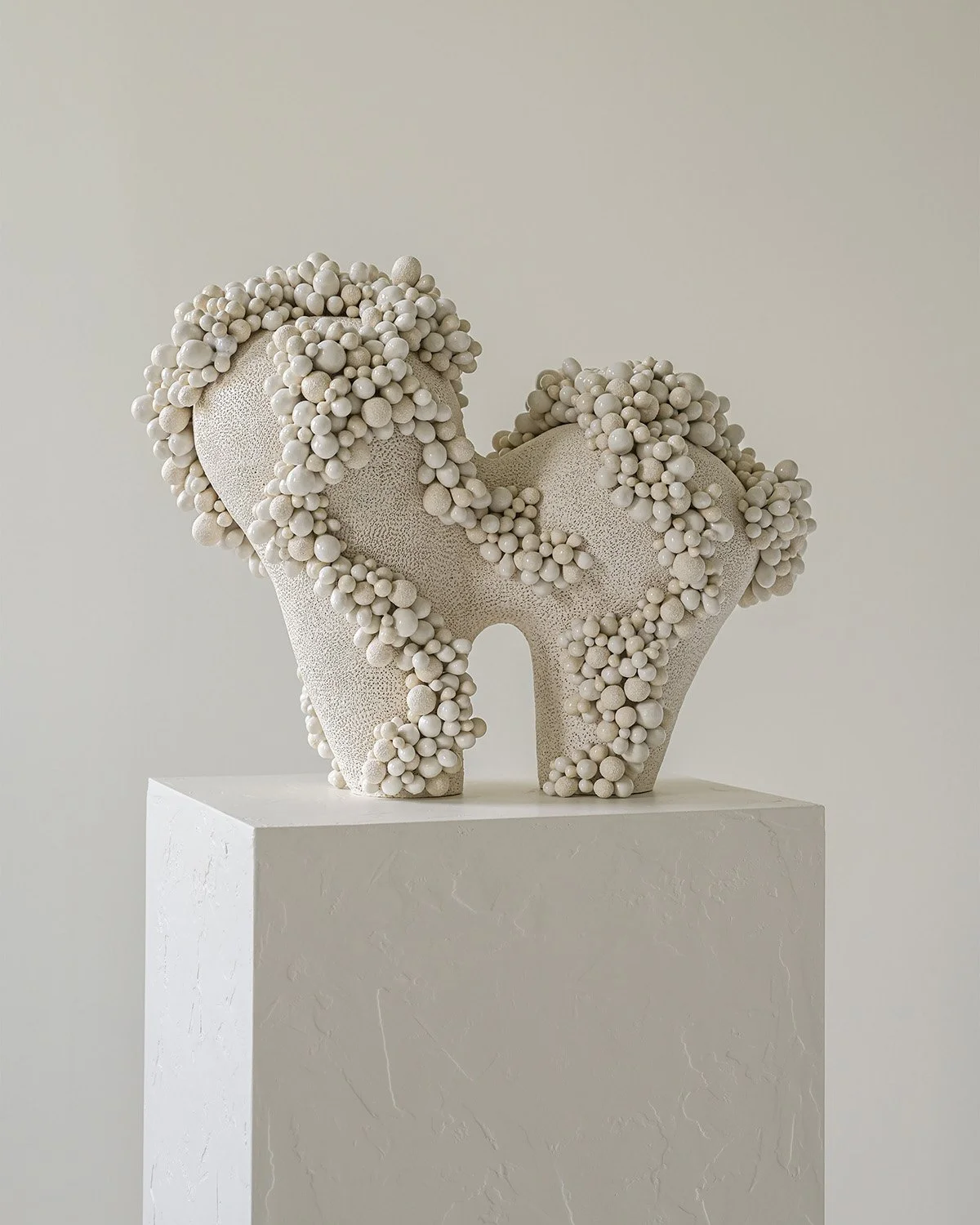 Her practice centers on unique ceramic sculptures that combine altered textures and abstract forms while maintaining a respect for clay in its essential state. Variations in tone and surface are carefully composed within a restrained palette, with considered glazing that enhances depth and presence. Historical references and architectural influences are interwoven with subtle natural cues, creating works that extend beyond fixed time or place.