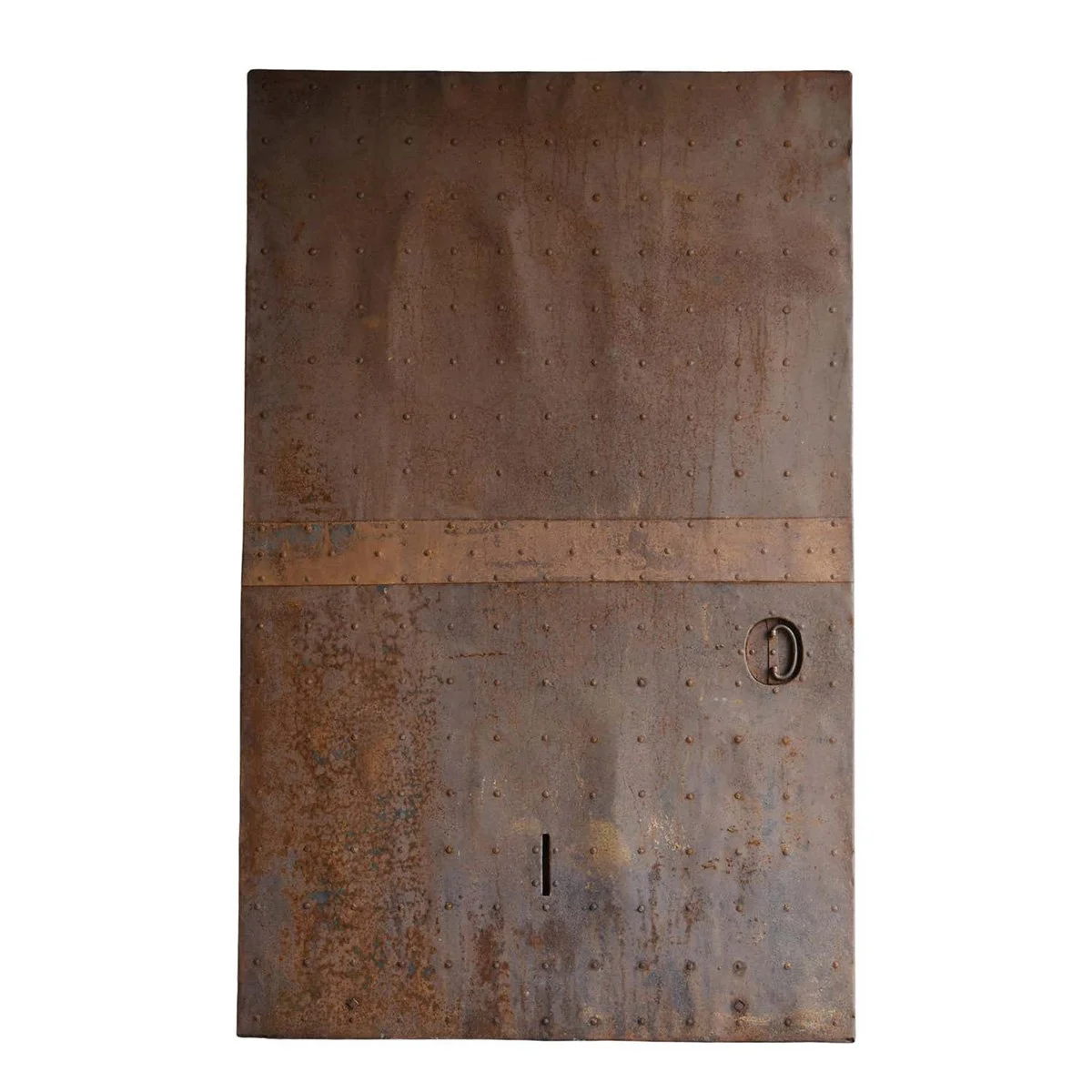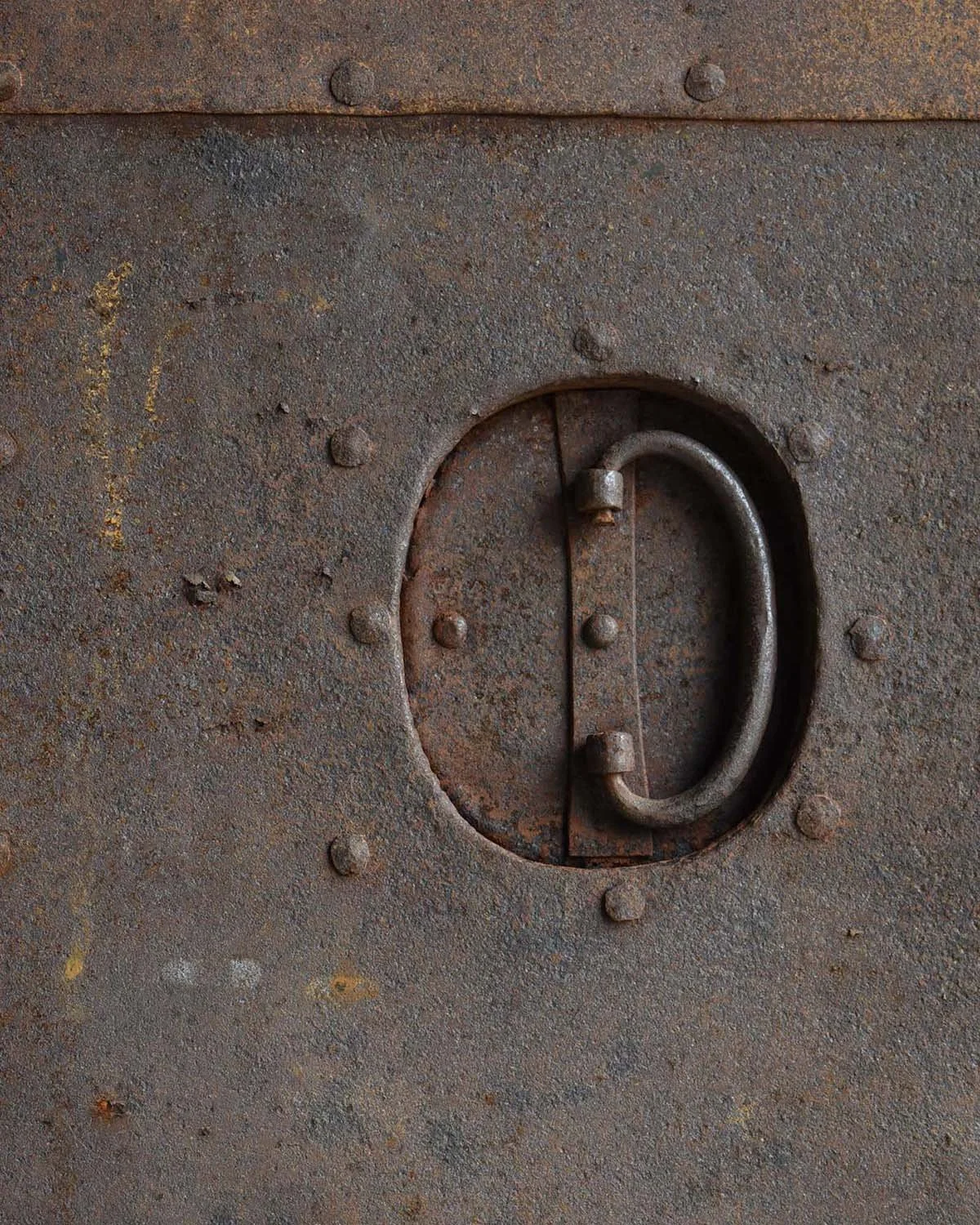 The surface bears a dense field of oxidation, developed gradually through exposure and use, giving the metal a depth and tonal variation that cannot be replicated. Subtle irregularities and riveted details remain visible across the plane, speaking to hand fabrication and early industrial process