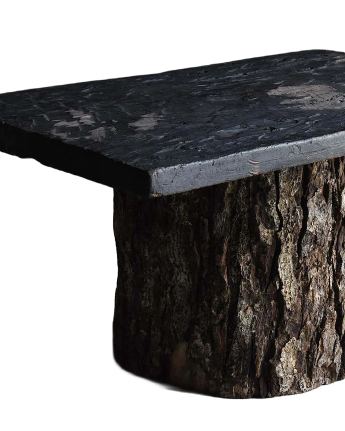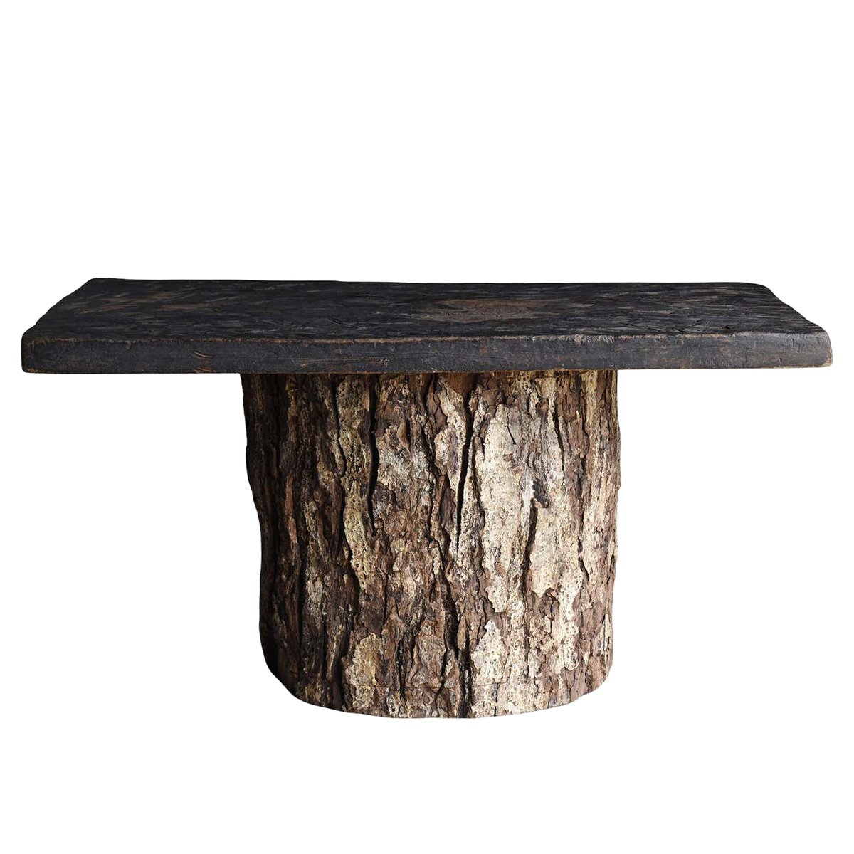 Japanese brutalist table constructed from a solid slab resting directly upon a tree-stump base. The piece retains the raw character of the original timber, with adze marks visible across the surface and the bark of the trunk left intact