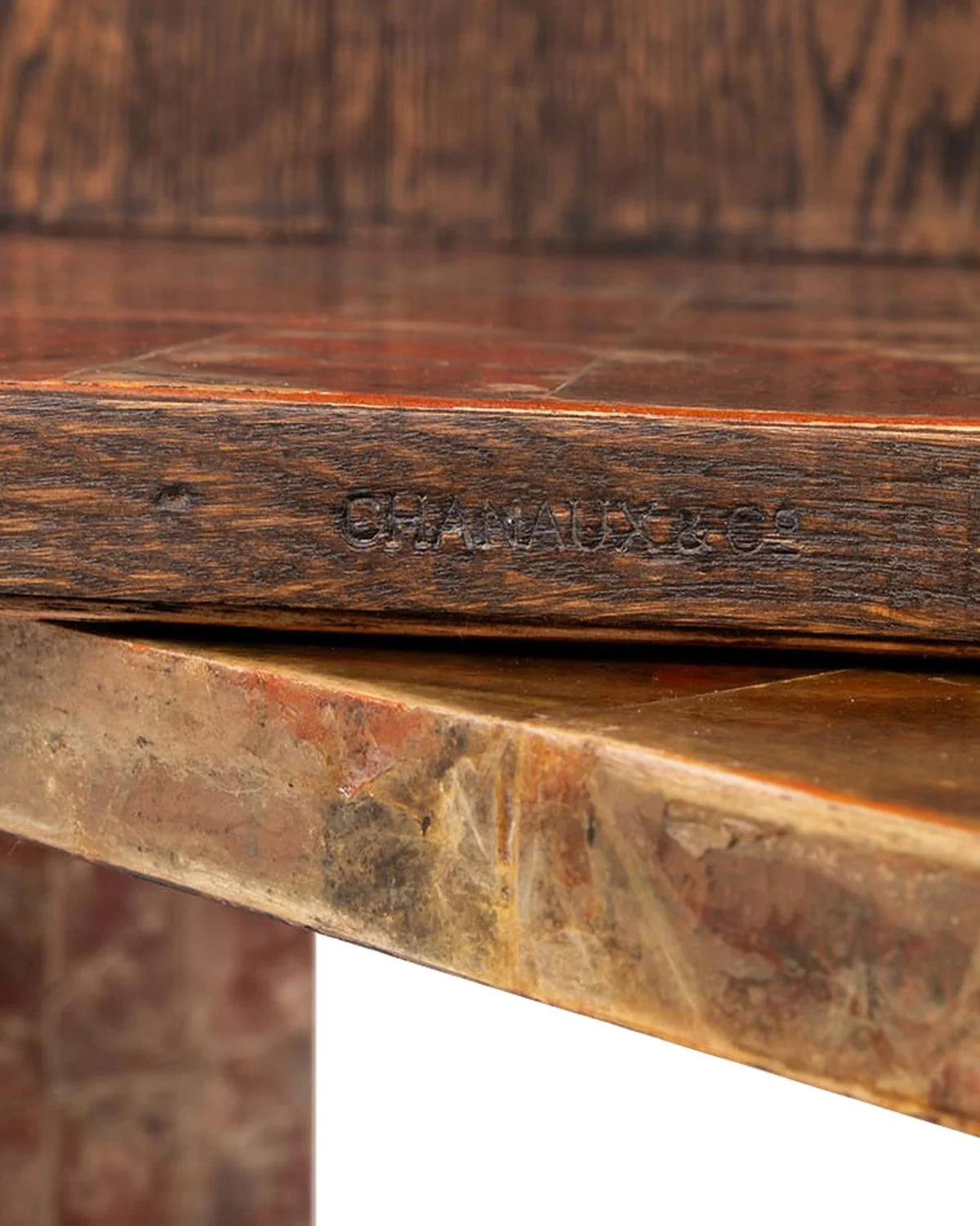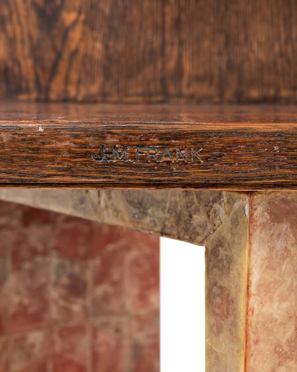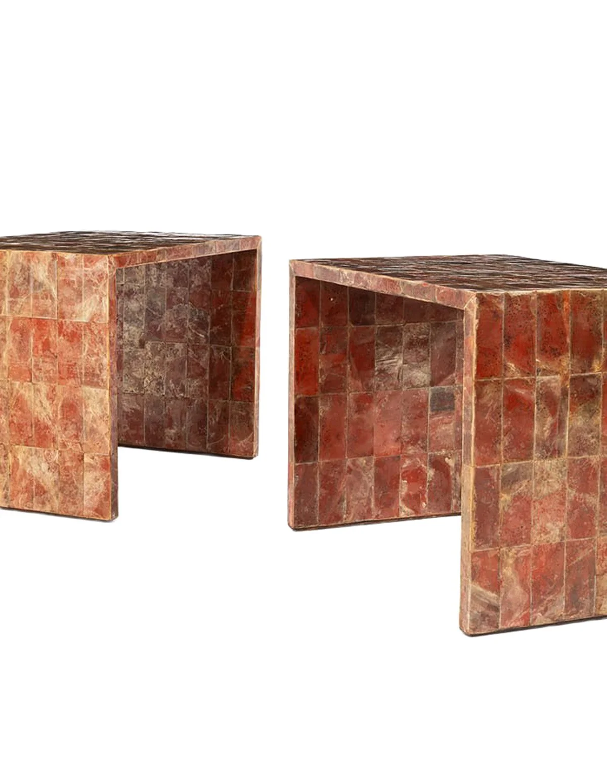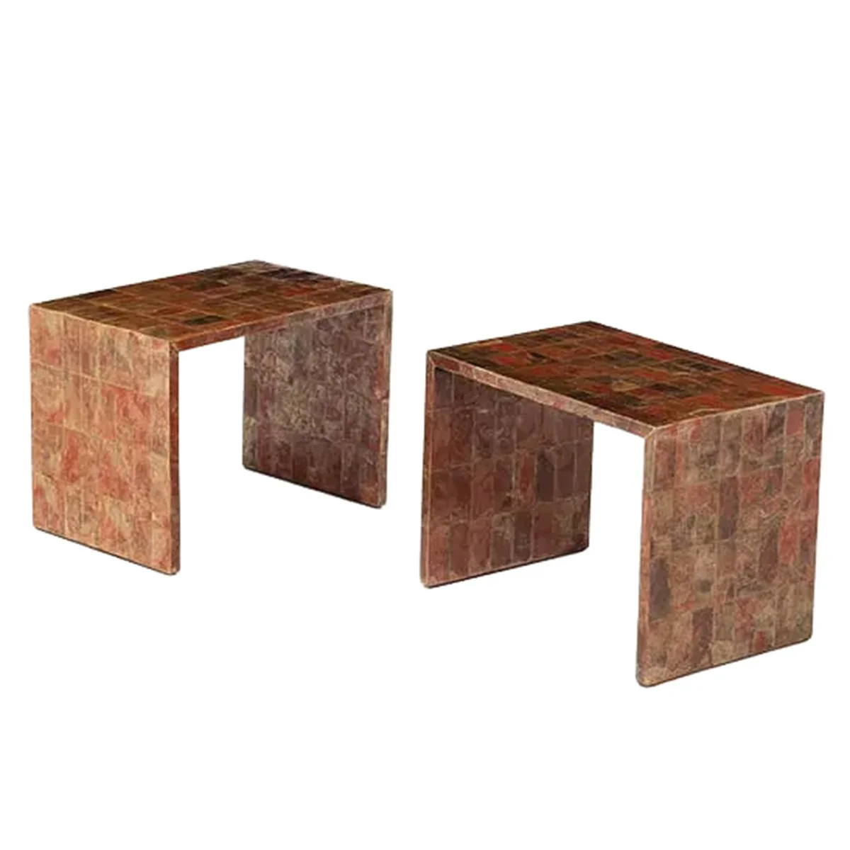 A low, irregular slab form by José Zanine Caldas, carved directly from the mass with A pair of low tables by Jean-Michel Frank, reduced to a strict, rectilinear form, the surfaces clad in mica to introduce a quiet variation within an otherwise exact geometrythree integrated supports. The surface retains natural undulation and tool traces, with a central void and softened edges shaped by hand