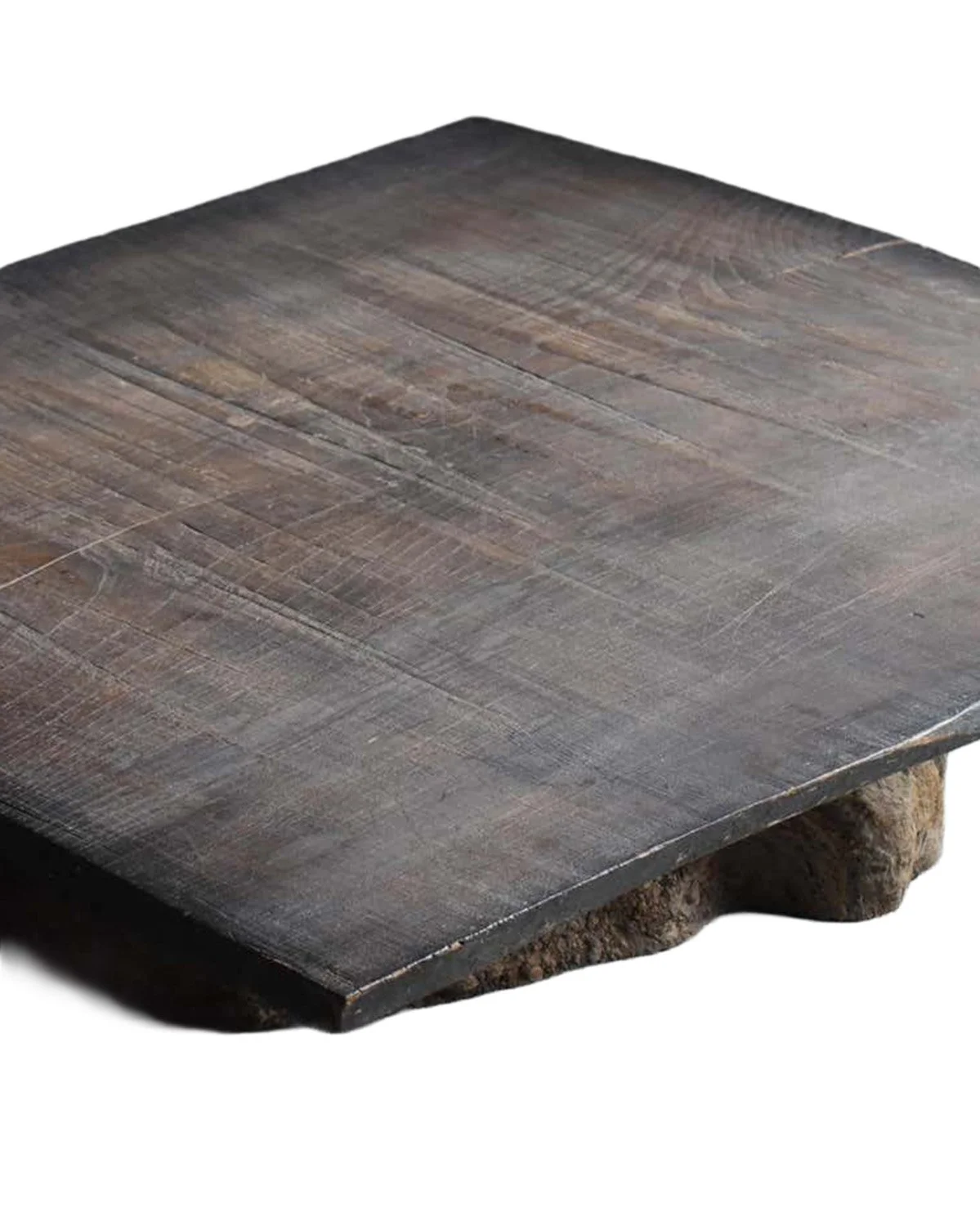 Single plank tabletop resting on a roughly carved base. The surface reveals the deep coloration and pronounced grain characteristic of aged Keyaki. Age-related splits are secured with iron staples