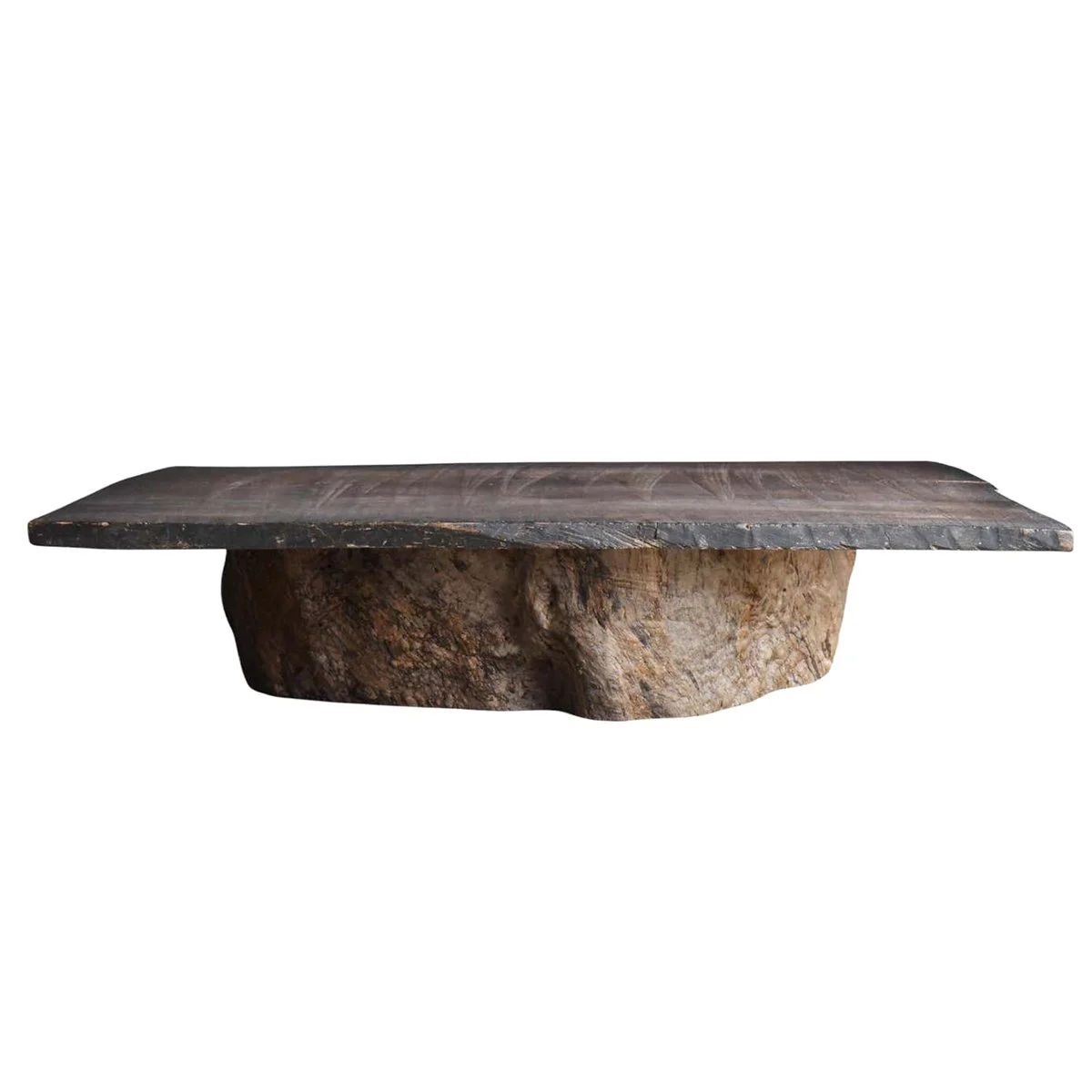 The heavy, irregular base contrasts with the thin planar top, creating a composition defined by mass, restraint, and material presence