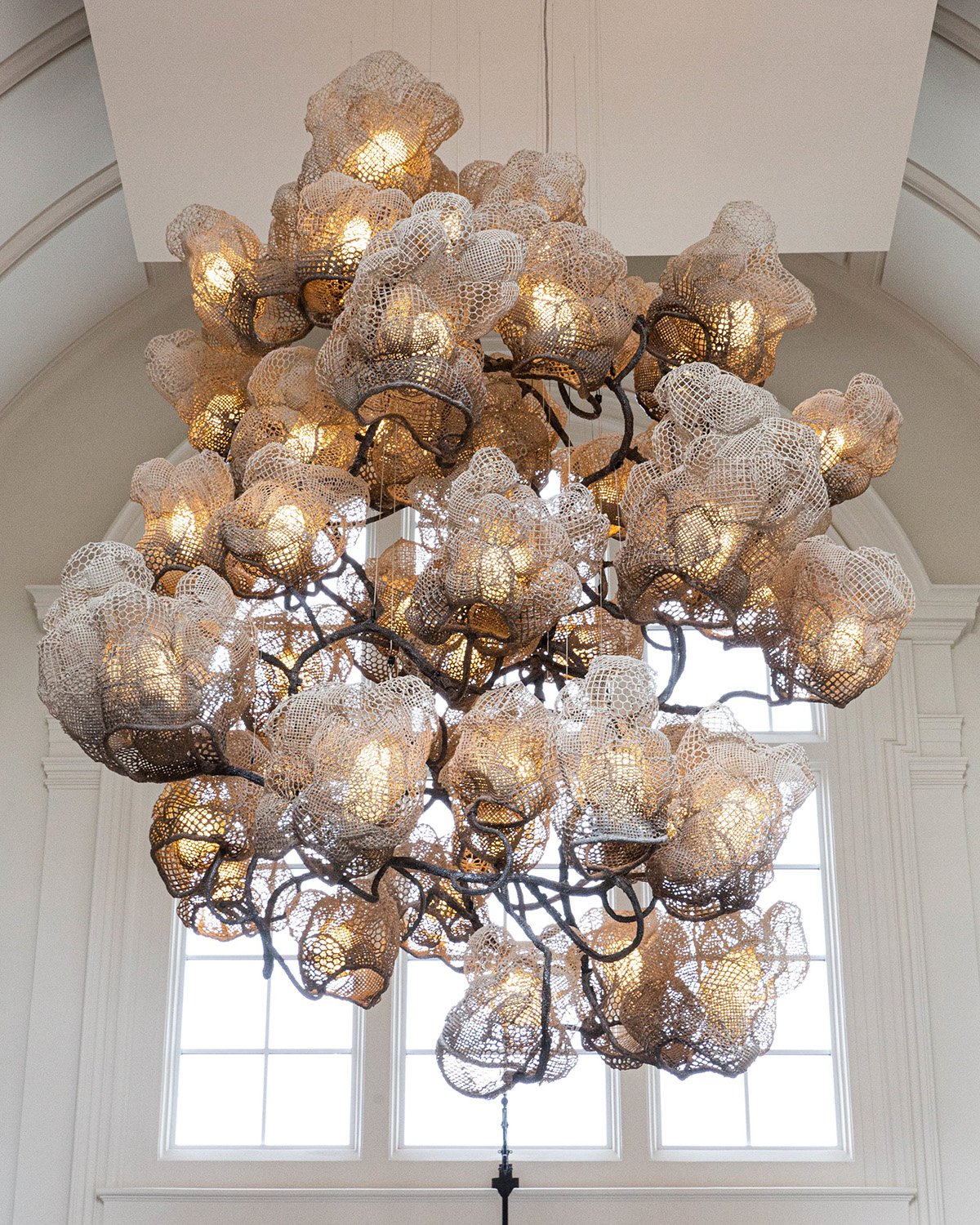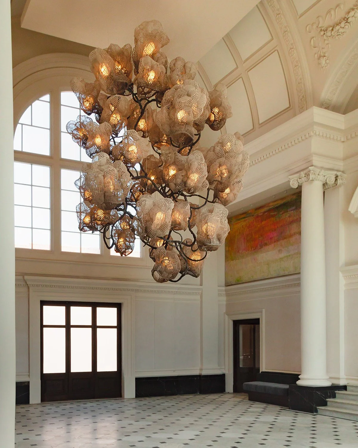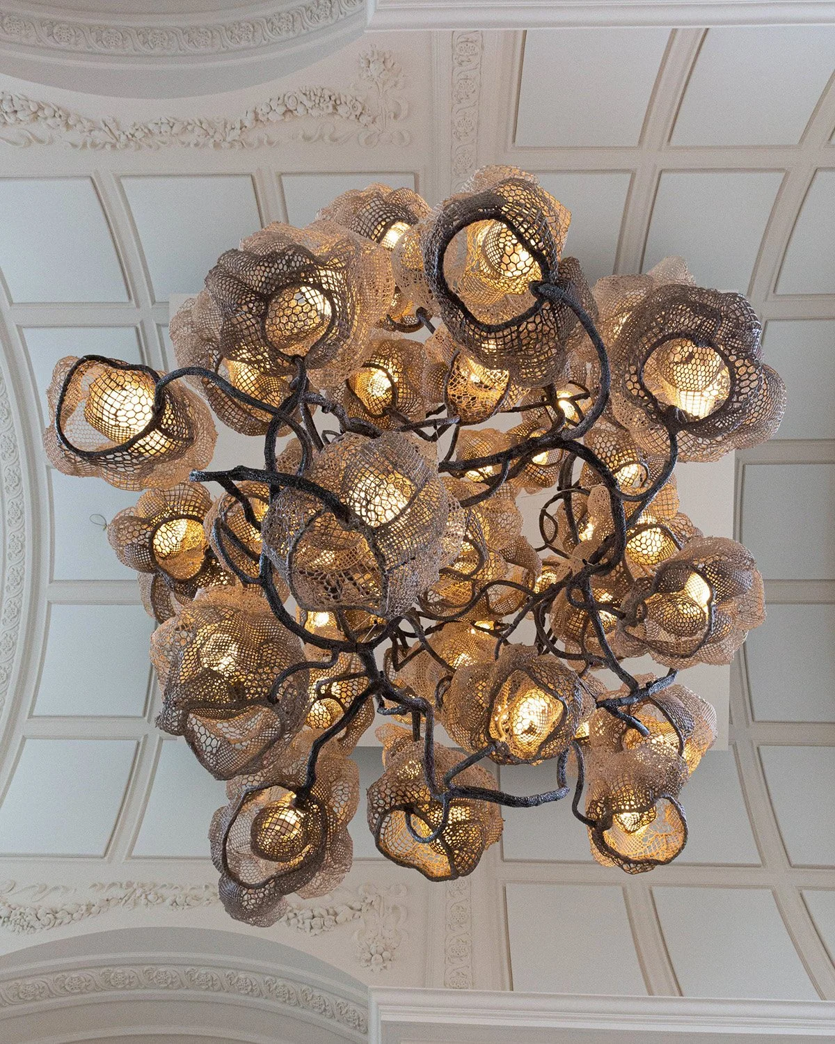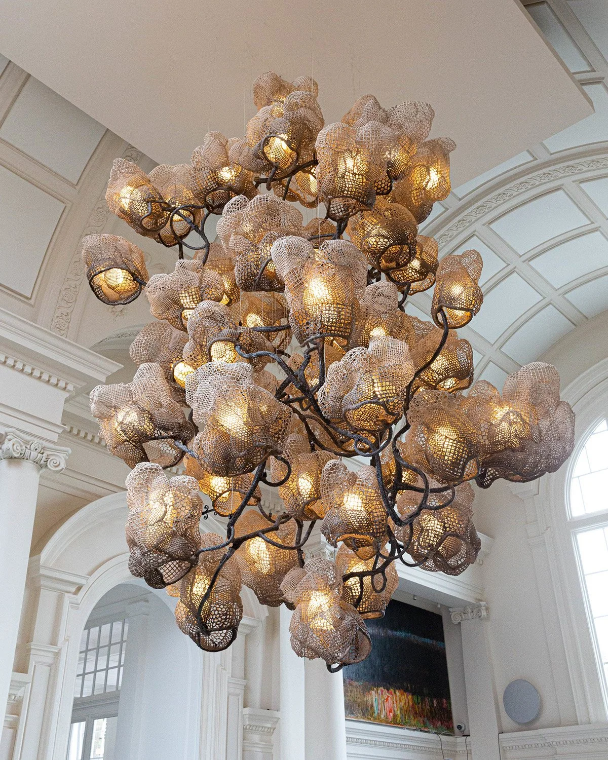 Nacho Carbonell’s Ladbroke Hall Cocoon Chandelier concaves into tree-like forms as it spawns into a luminescent forest hanging from above. Swathed in metal mesh with Paverpol and pigments, the metal welded branch cradles the soft, angelic glow of the light fittings and the decorative entanglement of the silicone cables wrapped within. The artist views objects as living organisms, where natural materials, textures and techniques come to life and spark imagination in the viewer