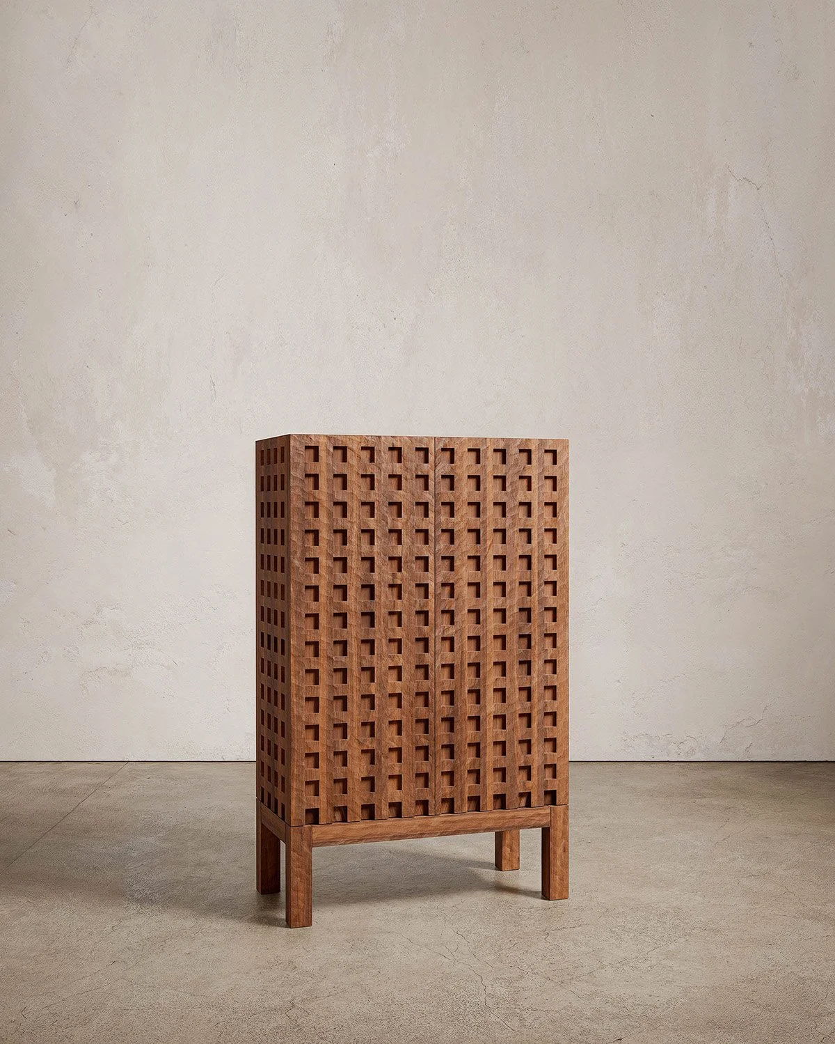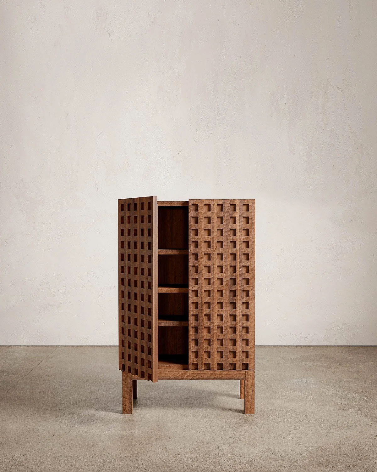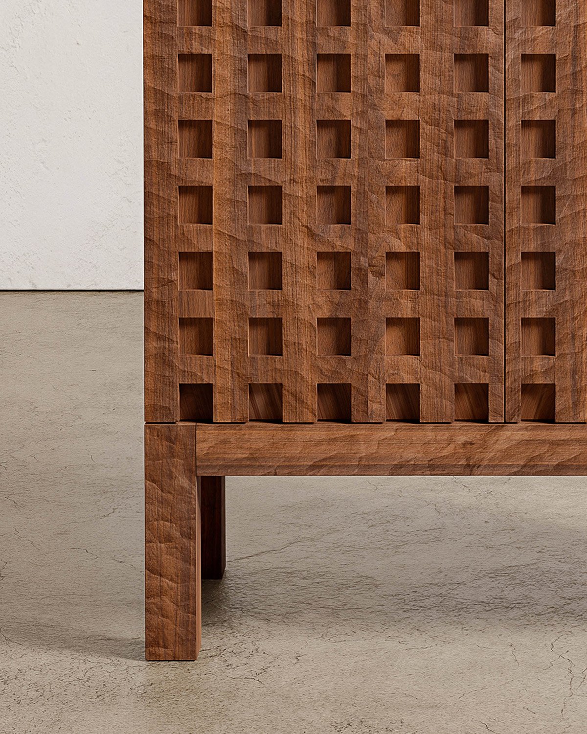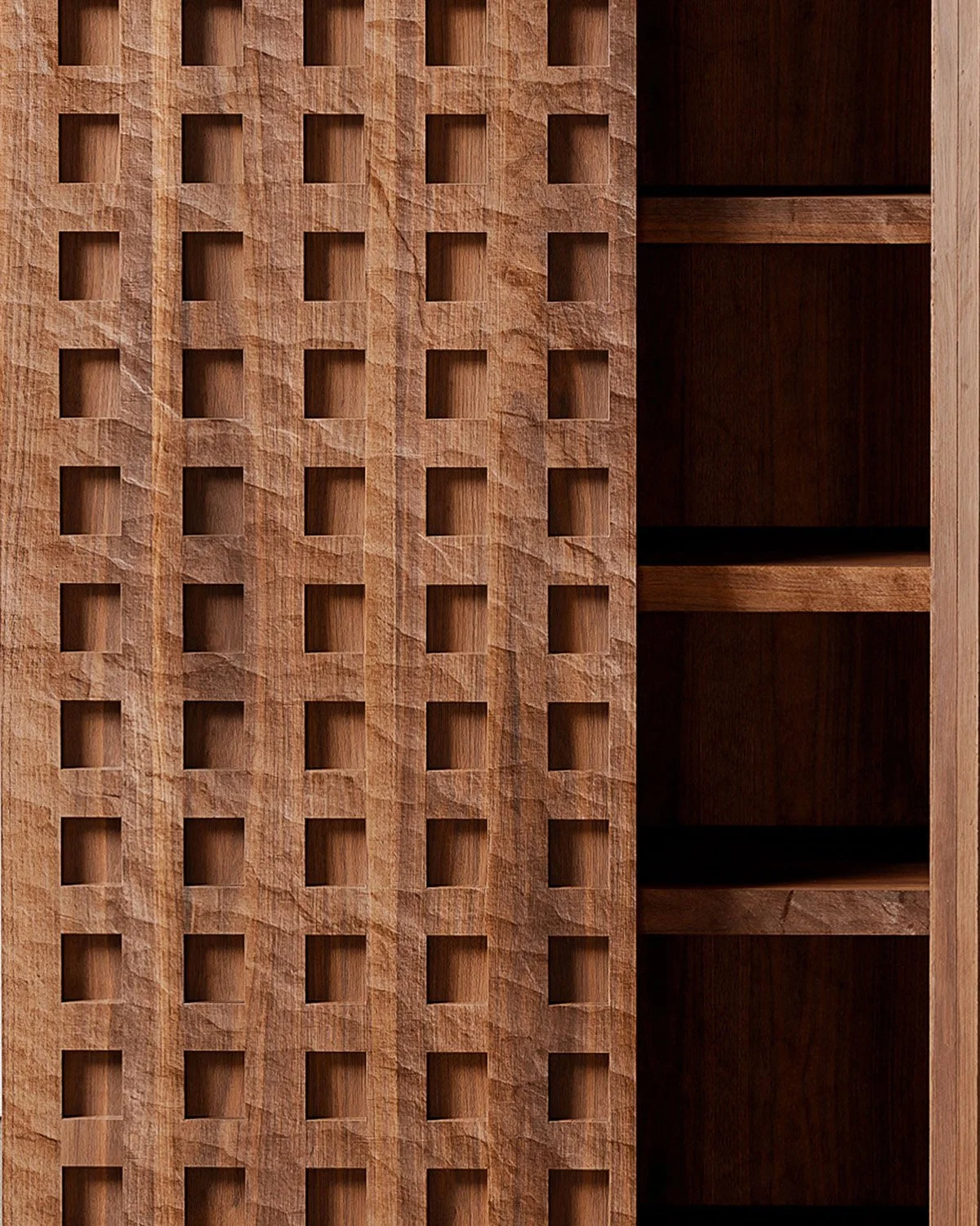 At the core of each work is an excavation: voids carved into the wood as an abstracted memory of caves and tombs. These are deliberate geometries, where repetition and serial patterning establish order. Negative space holds equal weight to mass, evoking interiors defined by shadow, light, and absence.
