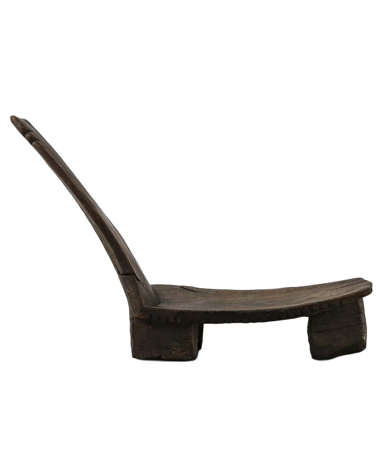 The chair is formed directly from the timber rather than assembled, with integral block feet supporting the underside. Tool marks, surface irregularities, and the darkened patina of the wood reflect decades of use and ageing, while the front edge of the seat is finished with a simple carved detailing that lightly articulates the form