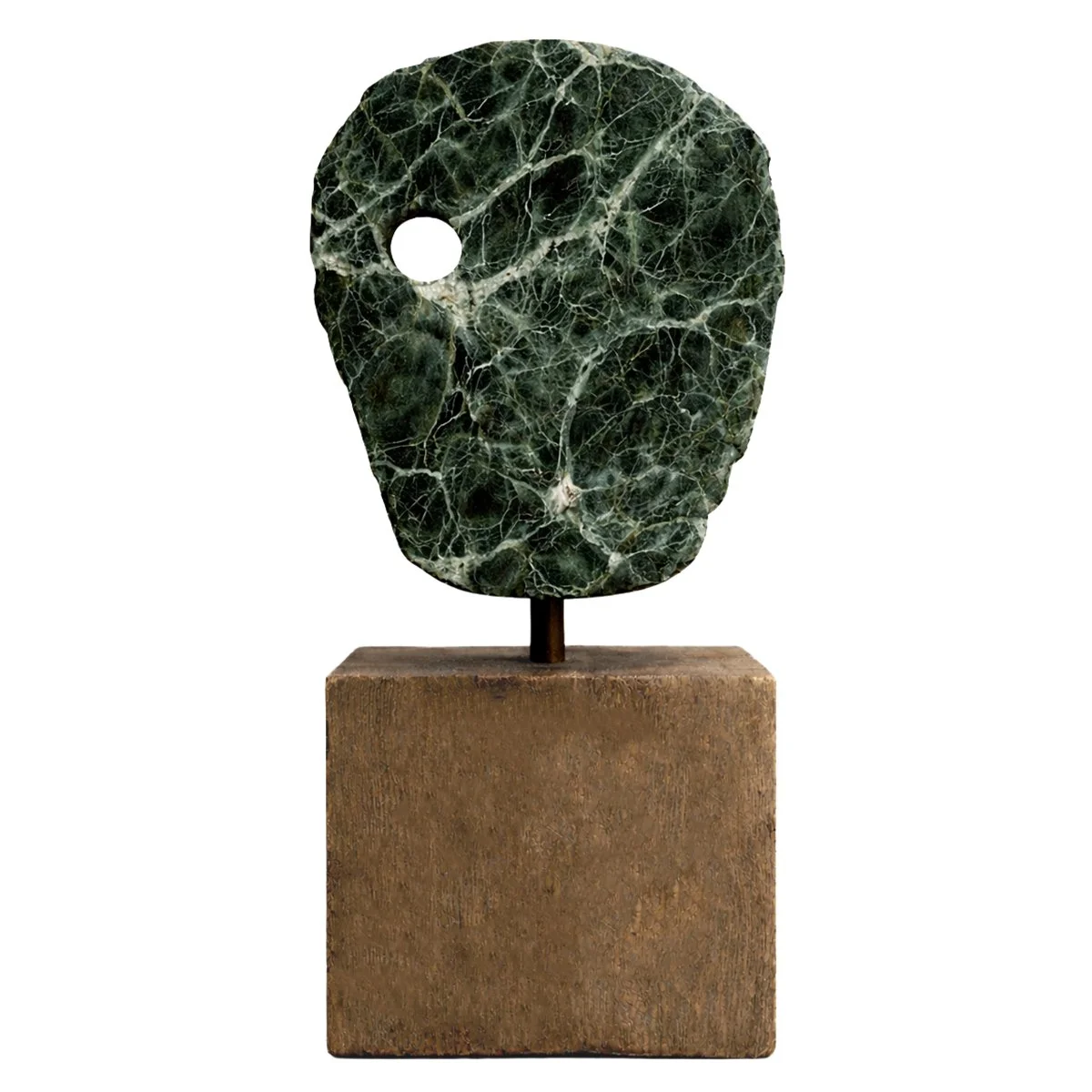 Carved from a slab of Verde Notte marble, the form presents a frontal mask defined by a rounded crown and a single circular aperture. The deep green ground of the stone is crossed by pale mineral veins that spread across the surface in branching networks