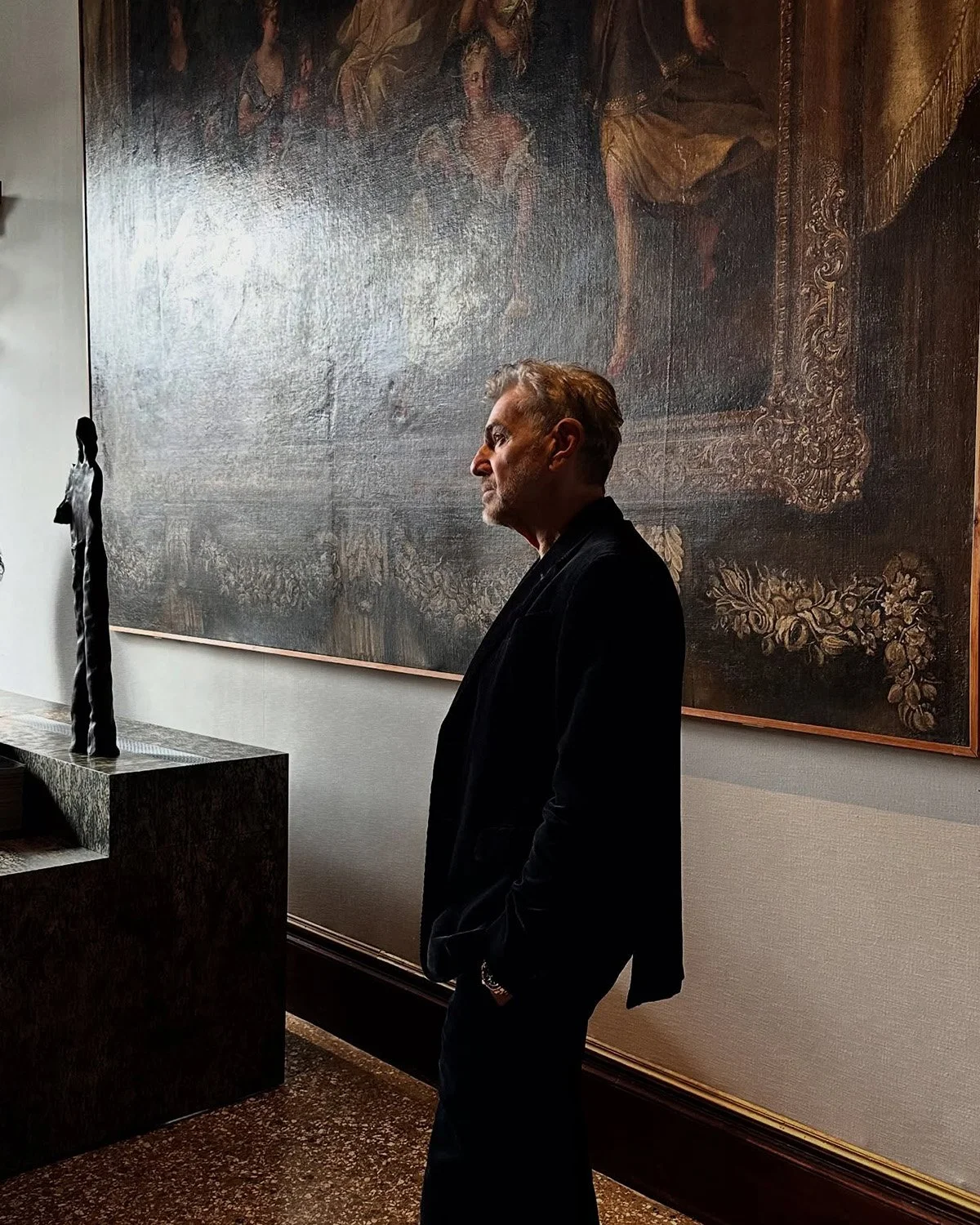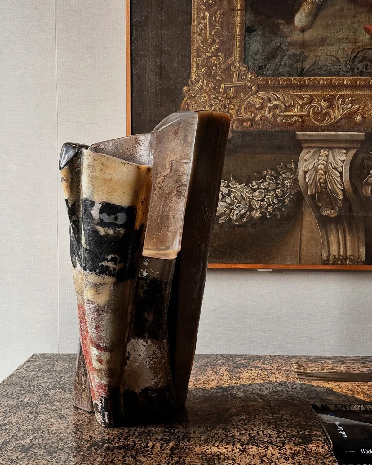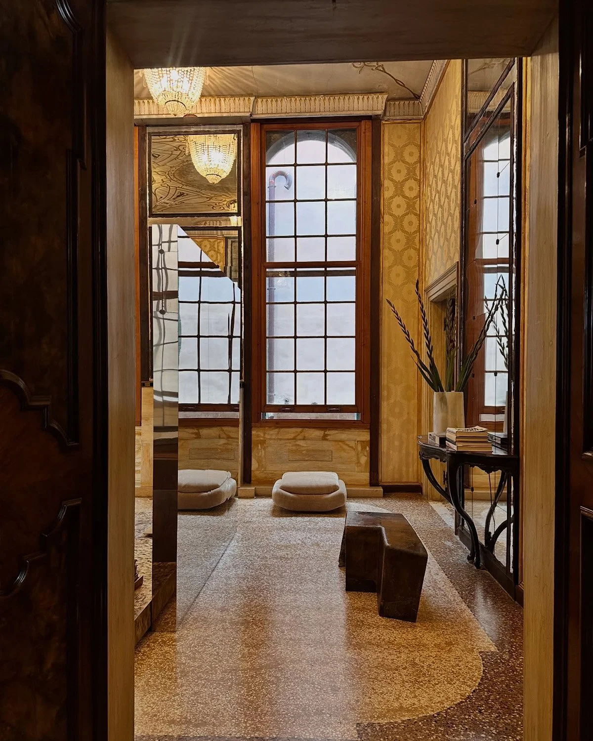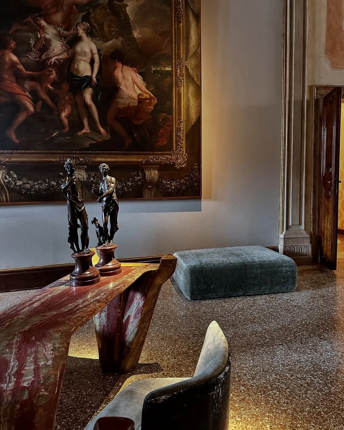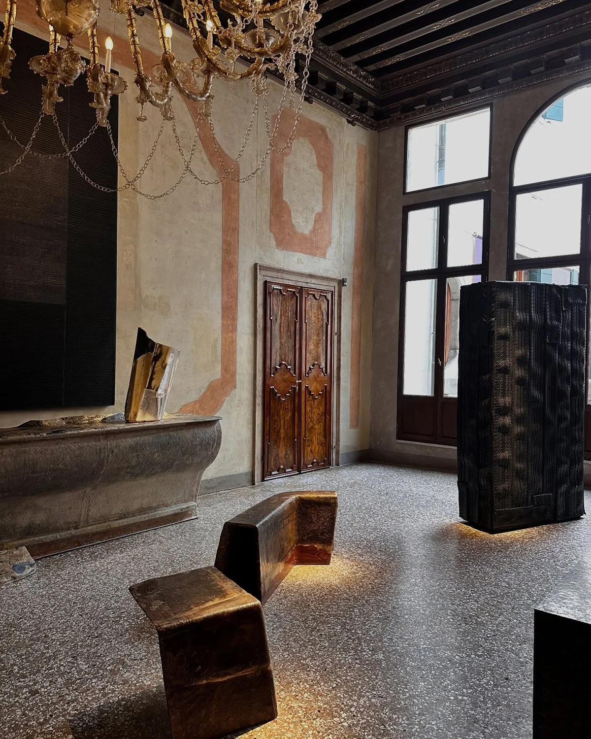 Within Palazzo Giustinian Lolin, that sensibility finds an especially resonant setting. These are not neutral interiors. Carved timber ceilings, terrazzo floors, large historical paintings, mirrored walls, and canal-facing windows all remain fully present. De Cotiis does not attempt to silence that history. Instead, he places his own language into direct contact with it. The effect is not one of contrast alone, but of compression, as though historical ornament, architectural wear, and contemporary material force have been drawn into closer alignment
