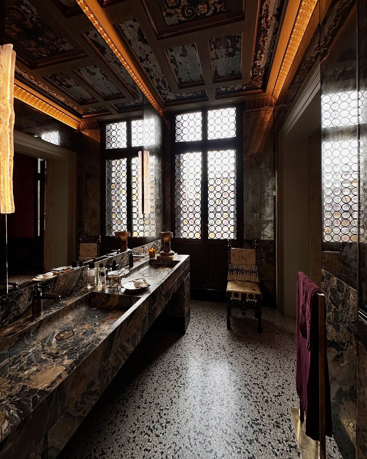 Even the more intimate rooms hold that same level of control. The bathroom, lined in heavily figured stone beneath illuminated ceilings and patterned glazing, feels as carefully resolved as the larger reception spaces. Nothing is casual, yet nothing feels sterile. That balance is crucial. De Cotiis understands that refinement alone is never enough. What gives these interiors their charge is the presence of friction: polished against distressed, translucent against opaque, historical grandeur against contemporary mass
