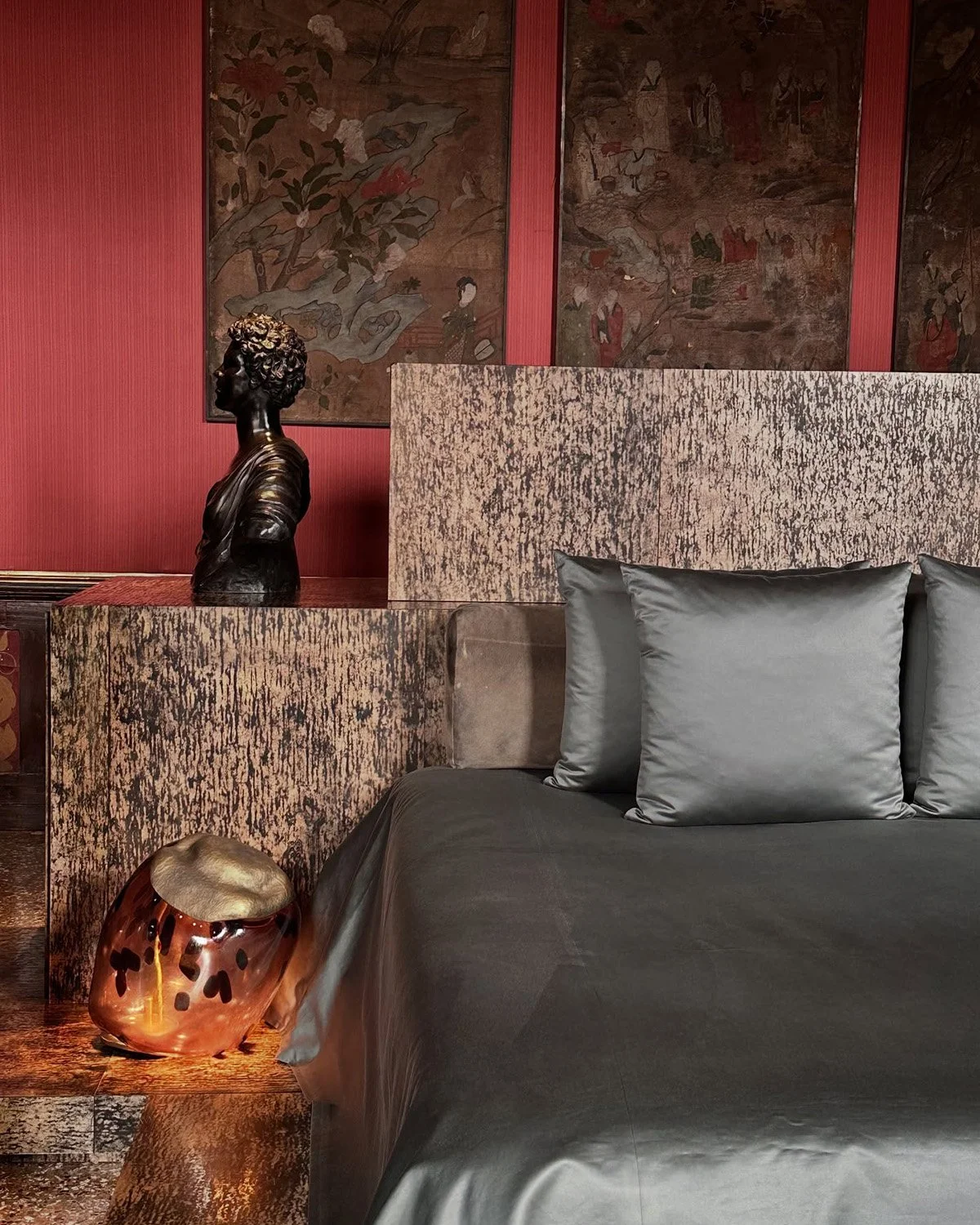 What emerges throughout is a sense of total environment. Furniture is never merely placed. It is absorbed into the architecture, the light, and the visual memory of the palazzo itself. A translucent amber-toned piece near an open window does not just occupy the sill; it catches the canal light and turns it into material. A reflective table sharpens the floor beneath it. A bed set against historic panels and rich red walls feels less like a display than an interior composed through tension, softness against hardness, saturation against restraint