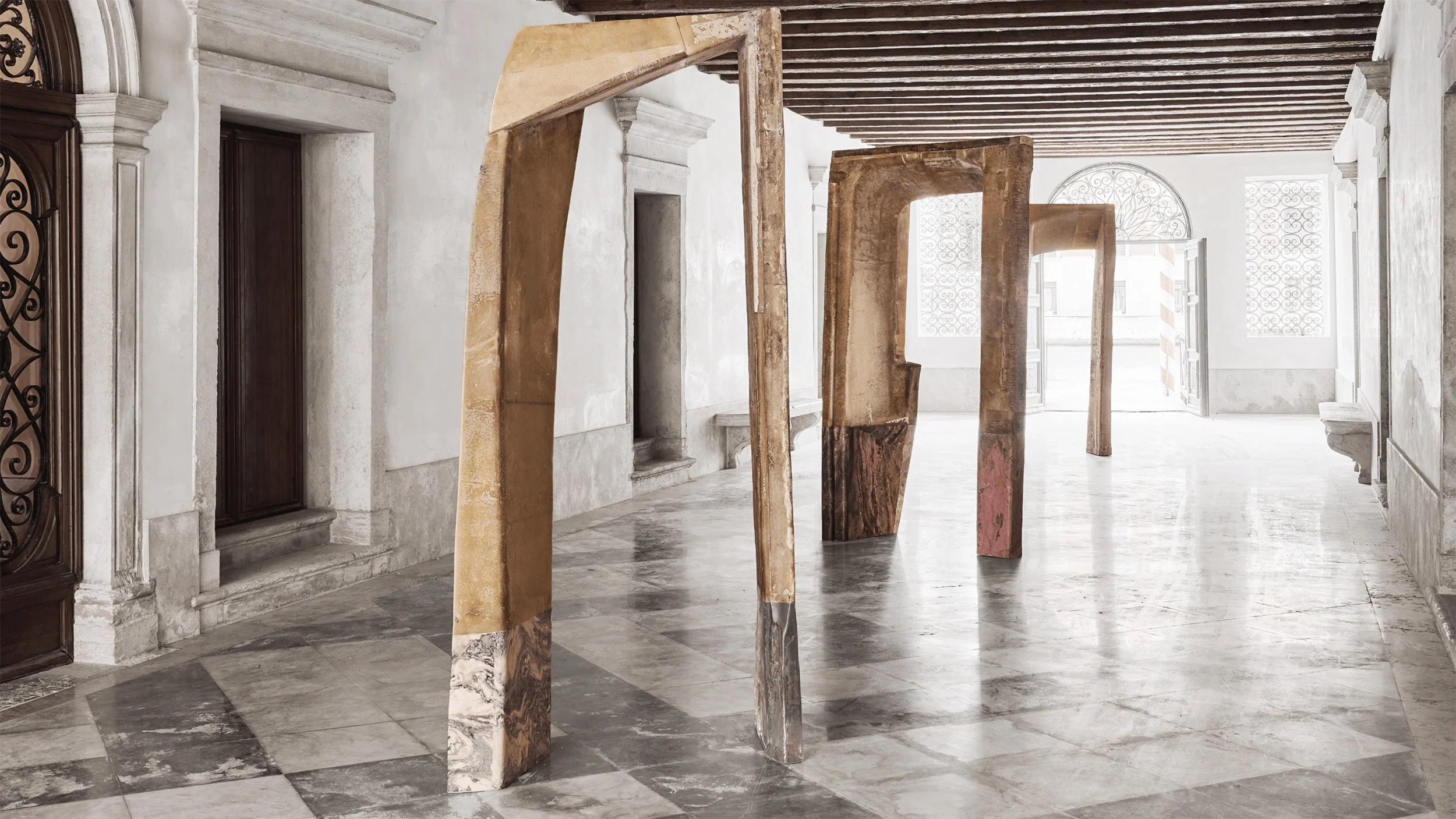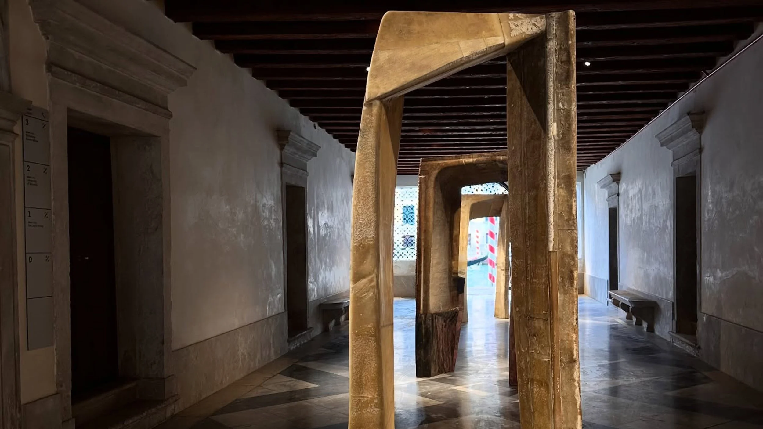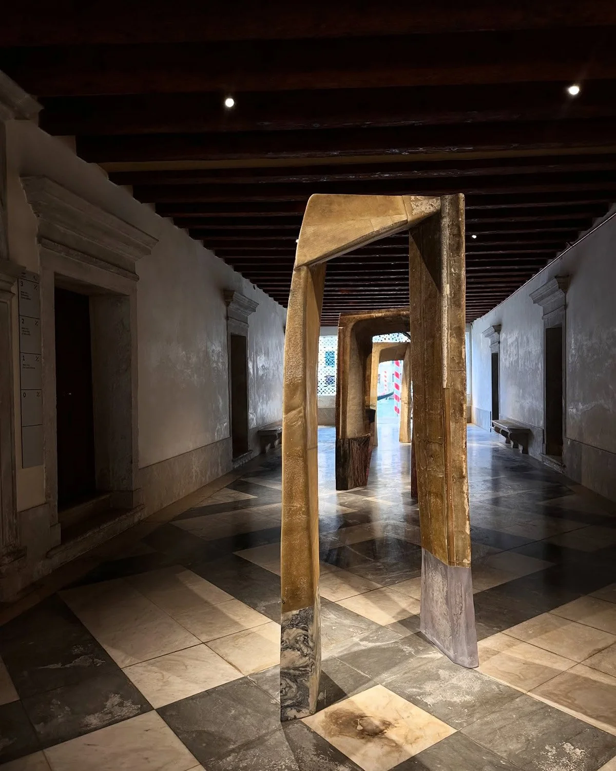 One of the strongest images shows a sculptural intervention standing within a long corridor, its upright forms cutting through the quiet of the palazzo with measured force. It is a distilled expression of the foundation as a whole. De Cotiis neither imitates the building nor defers to it. He allows architecture, object, and atmosphere to intensify one another. The rooms do not become backgrounds, and the works do not become intrusions. Each sharpens the next